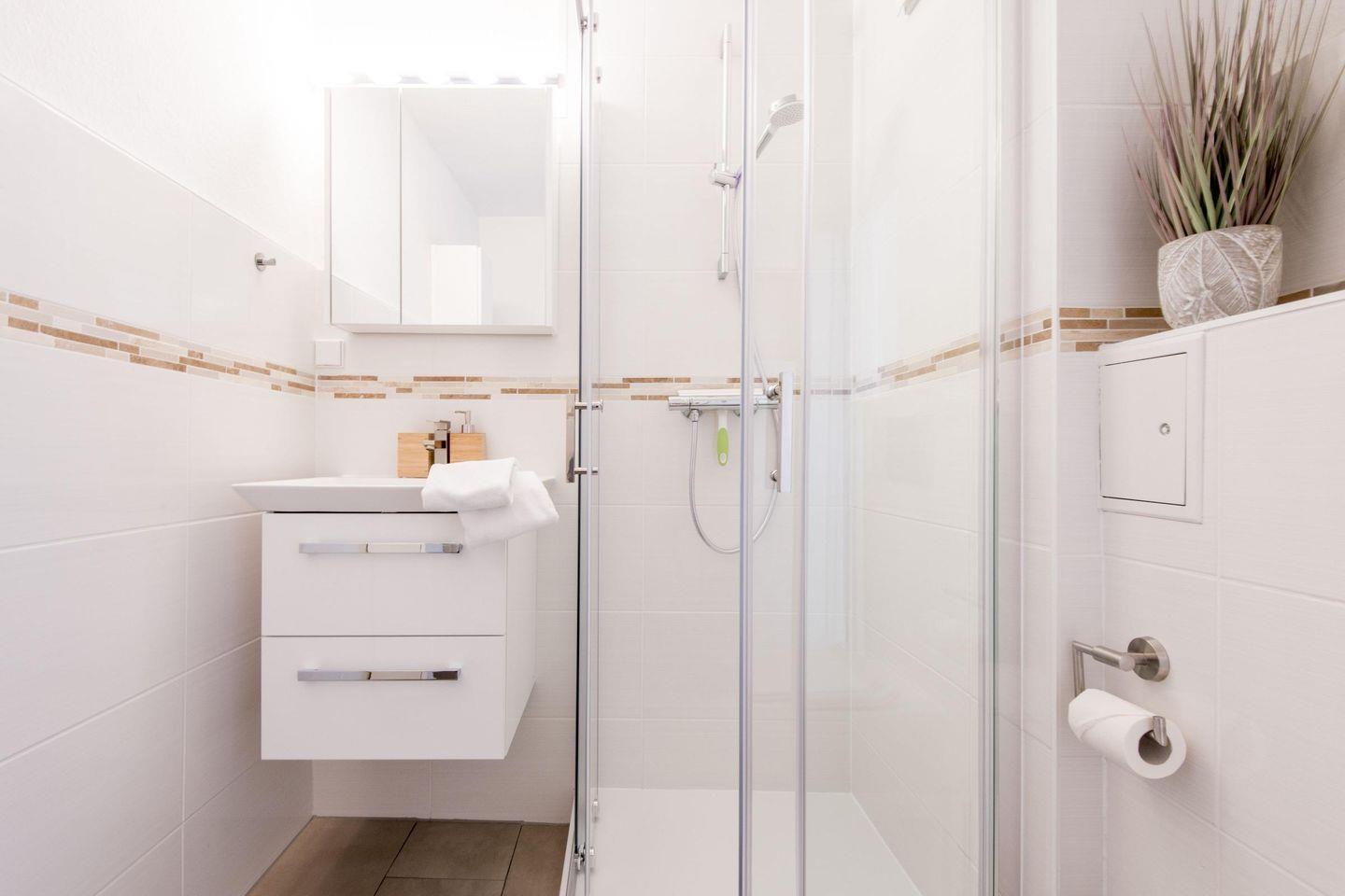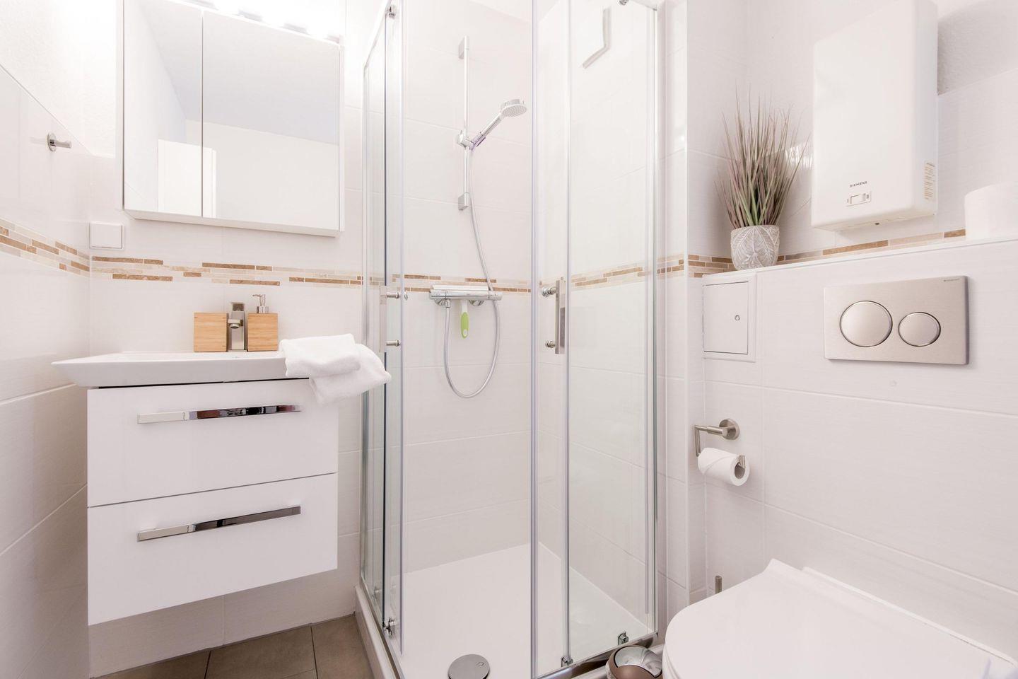 Das moderne Badezimmer verfügt über eine Dusche und ein WC. Die moderne Ausstattung bietet Ihnen alles, was Sie für einen entspannten Start in den Tag oder zur Erfrischung nach einem langen Strandtag benötigen.