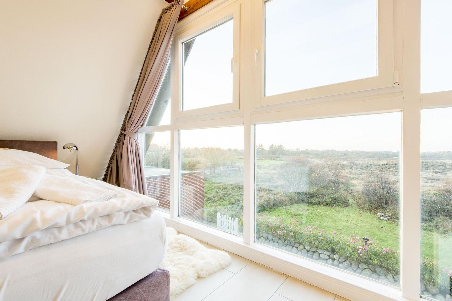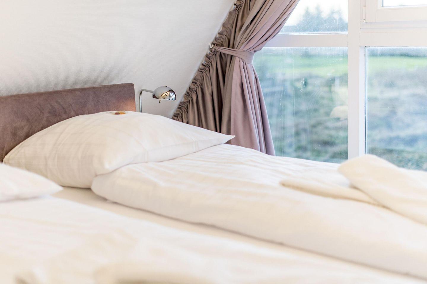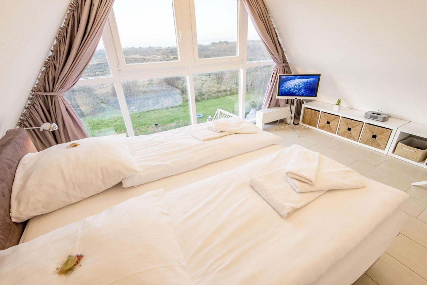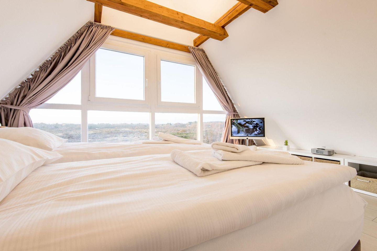 Das erste Schlafzimmer im Obergeschoss bietet ein Doppelbett (180x200 cm), TV und einen einzigartigen Ausblick über die Heide. Das zweite Schlafzimmer verfügt über ein Doppelbett (200x200 cm) und einen TV, während das dritte Schlafzimmer mit einem Einzelbett (90x200 cm) ideal für ein Kind oder eine zusätzliche Person ist.