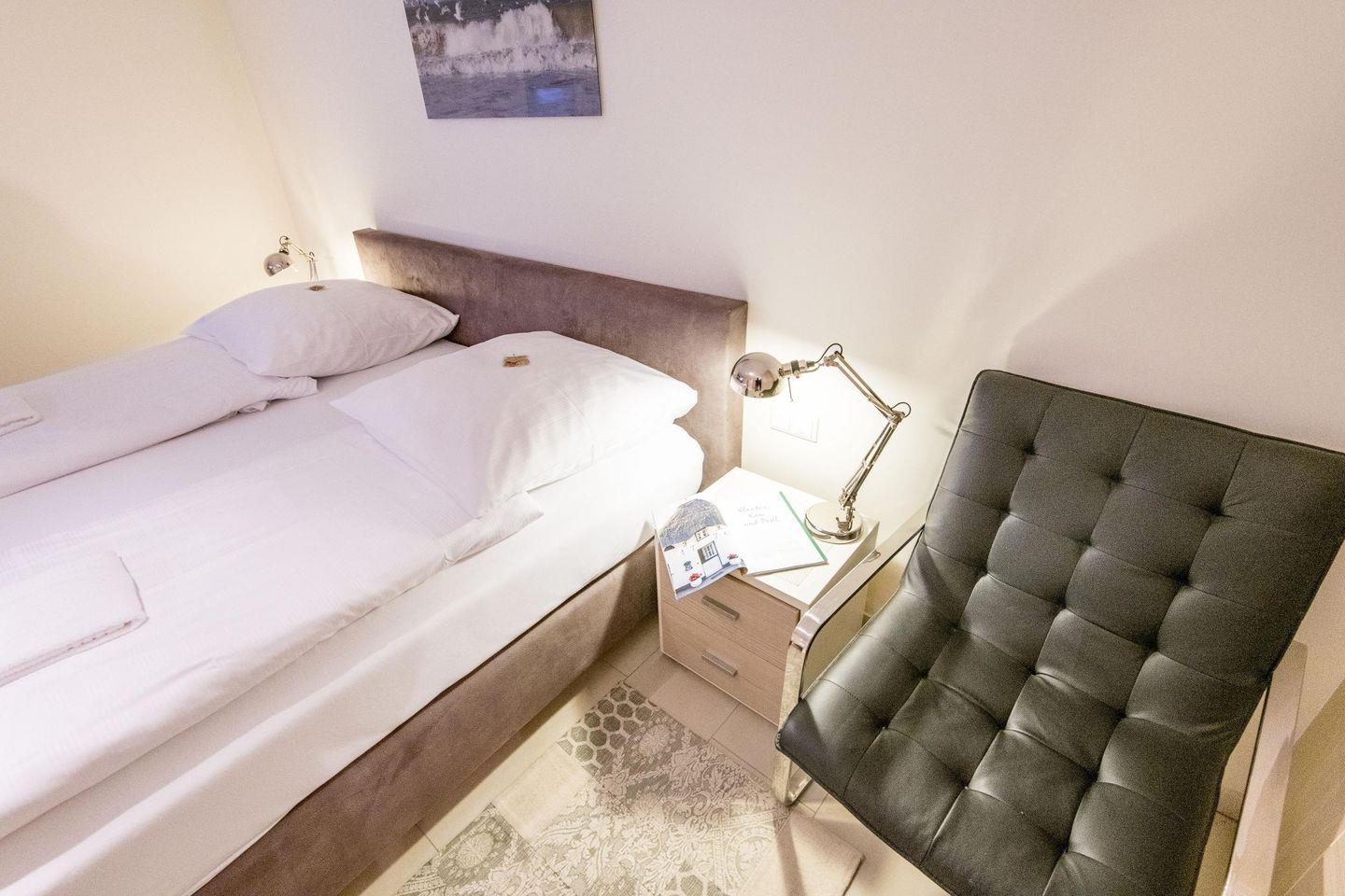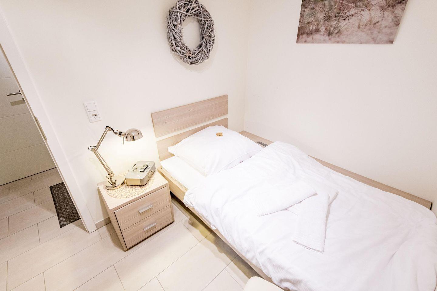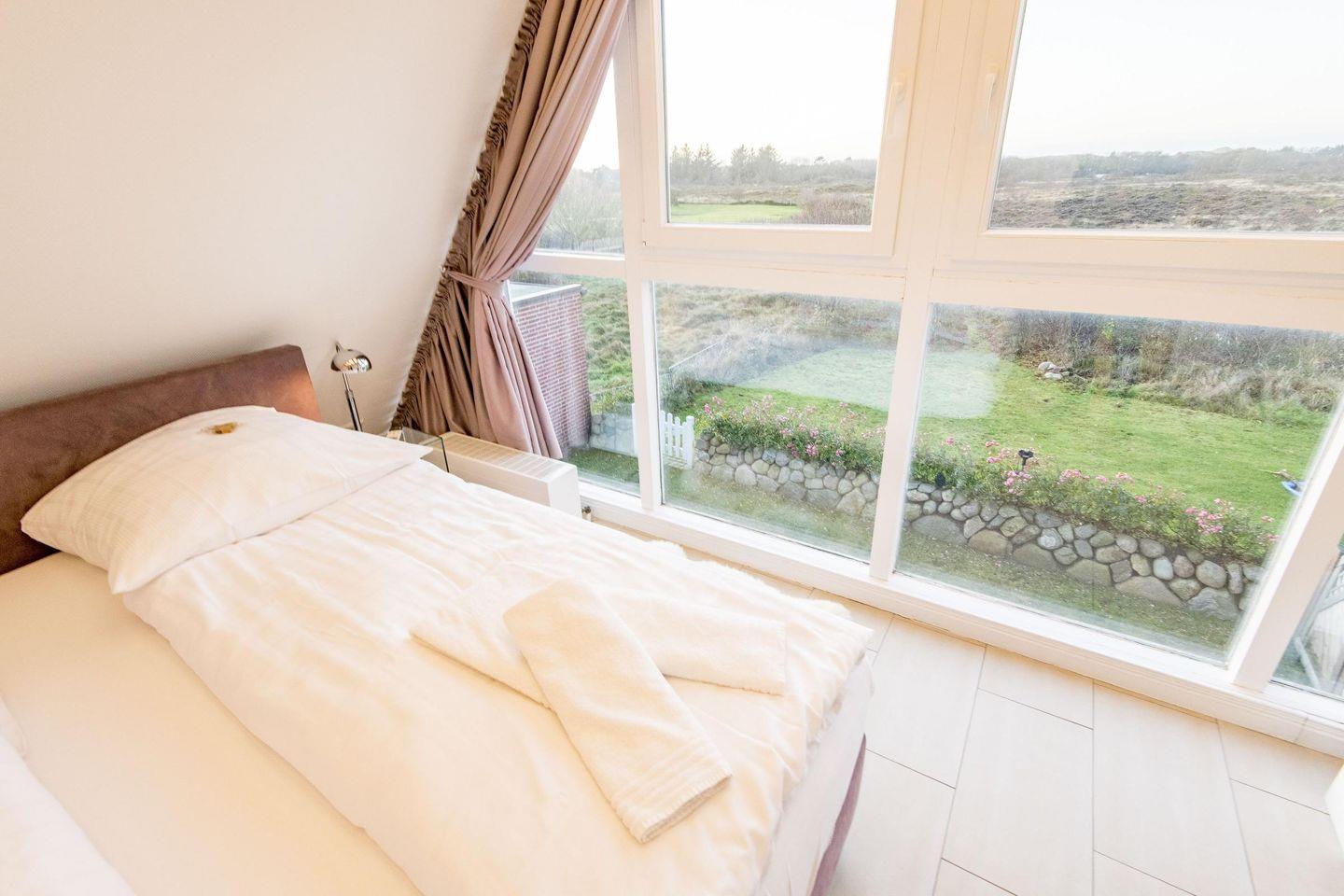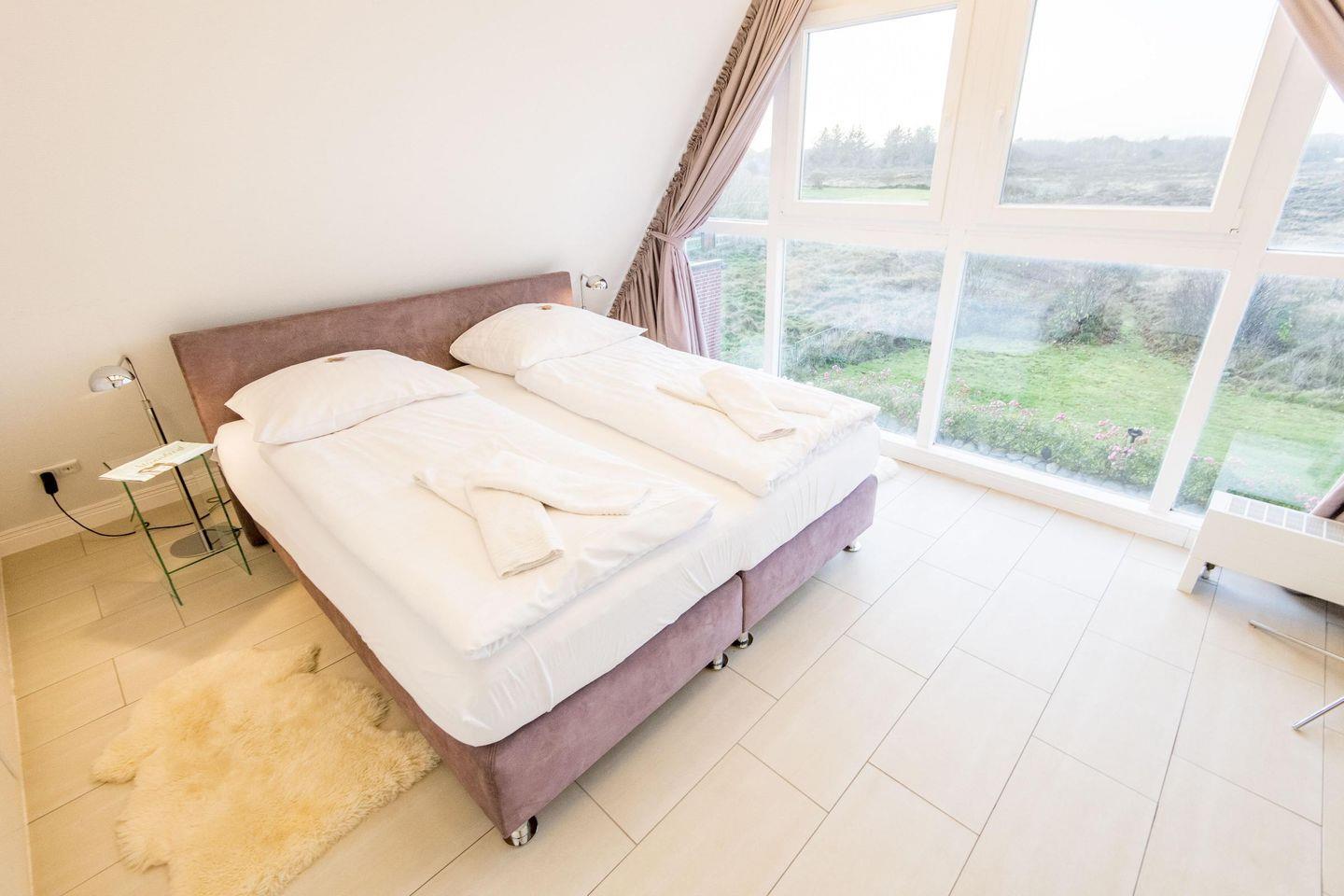 Das erste Schlafzimmer im Obergeschoss bietet ein Doppelbett (180x200 cm), TV und einen einzigartigen Ausblick über die Heide. Das zweite Schlafzimmer verfügt über ein Doppelbett (200x200 cm) und einen TV, während das dritte Schlafzimmer mit einem Einzelbett (90x200 cm) ideal für ein Kind oder eine zusätzliche Person ist.