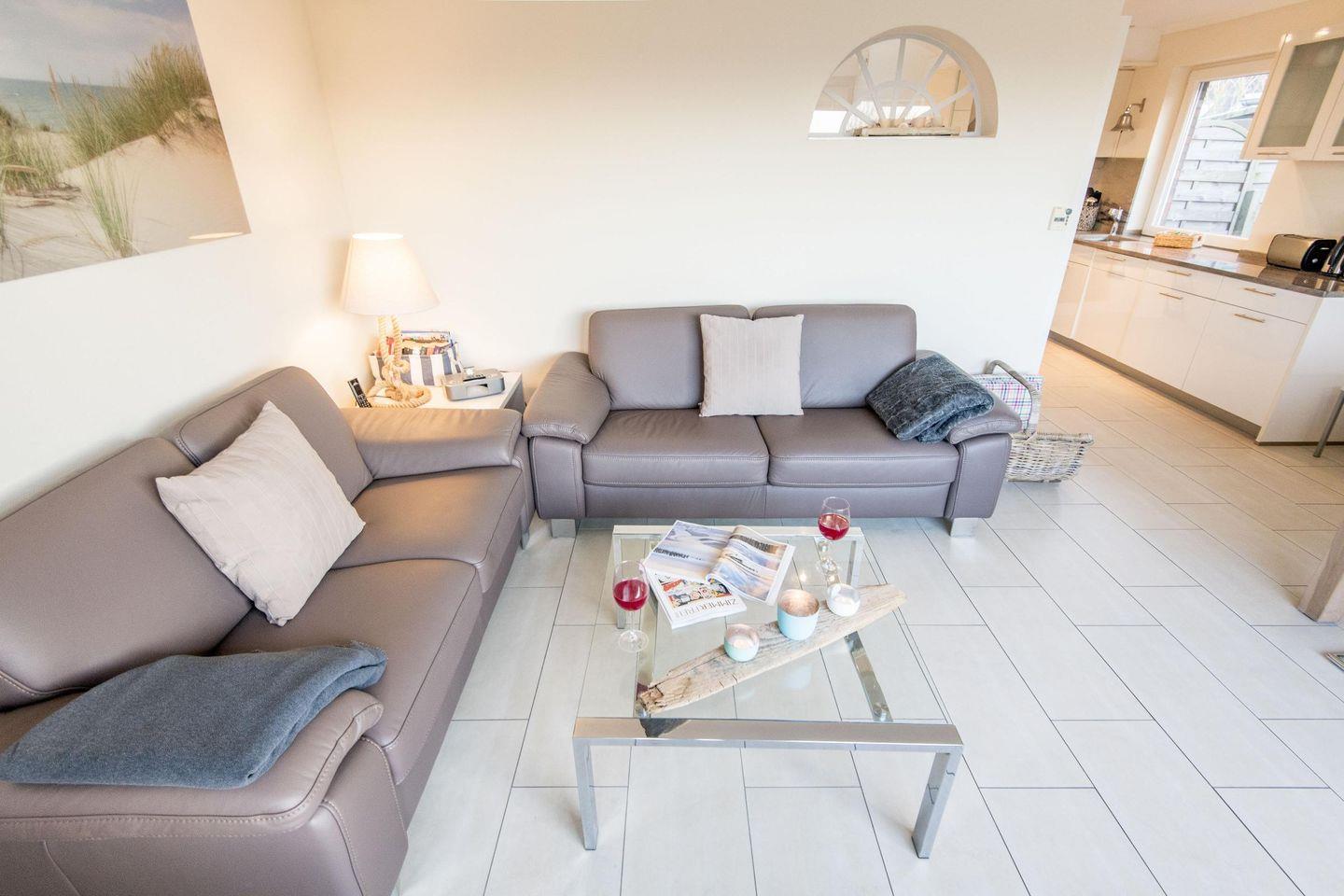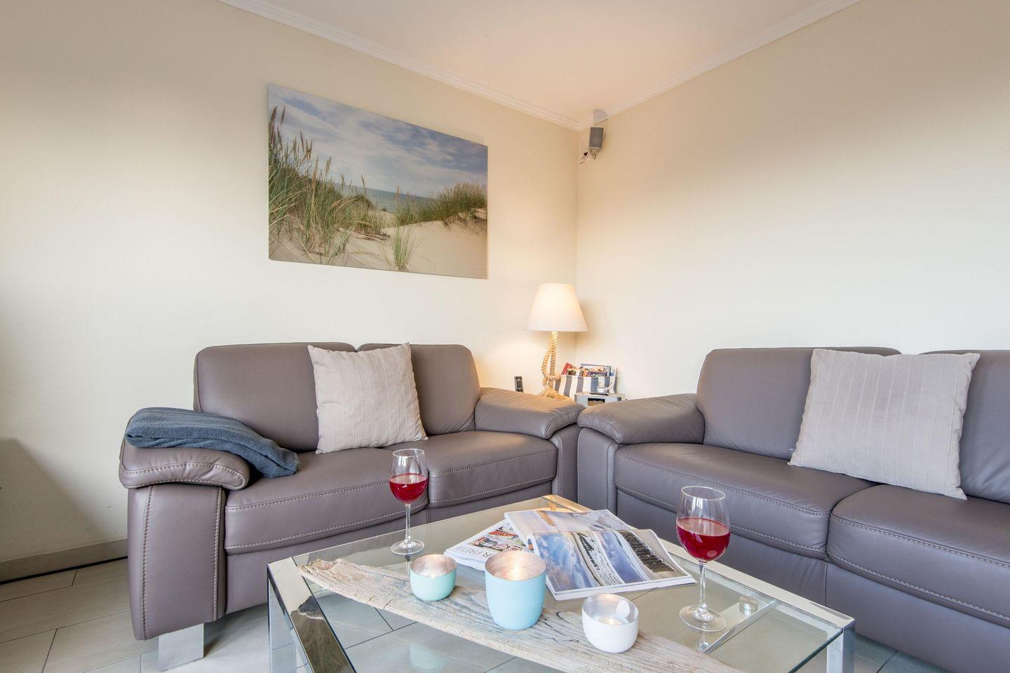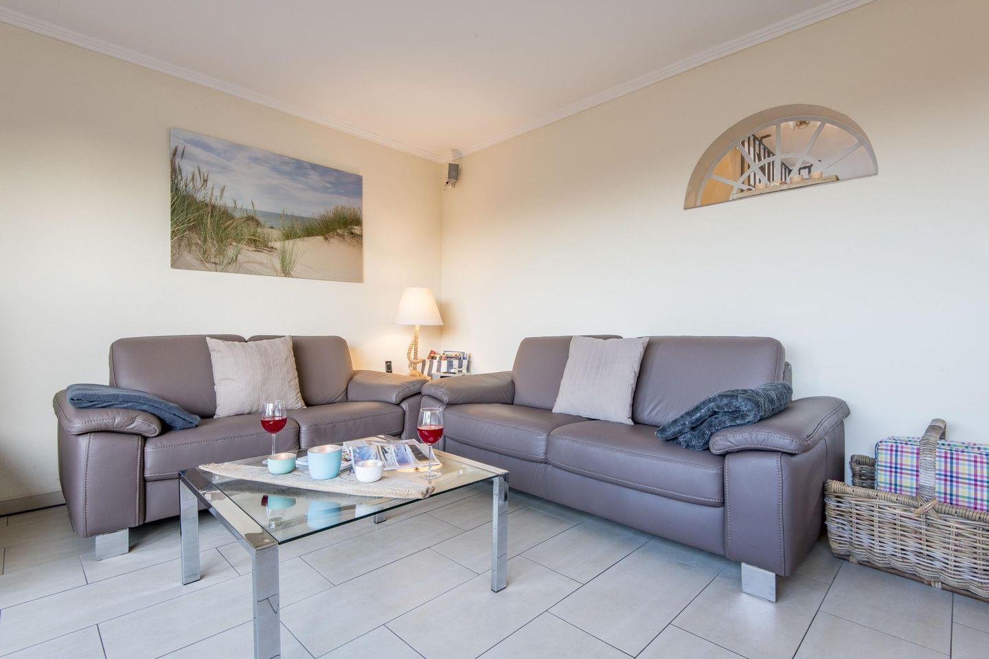 Das stilvolle Wohnzimmer ist mit einem komfortablen Sofa und hochwertigen Möbeln ausgestattet. Eine große Fensterfront bietet einen traumhaften Ausblick über die Heide und sorgt für eine lichtdurchflutete Atmosphäre. Vom Wohnzimmer aus haben Sie direkten Zugang zur großzügigen, möblierten Westterrasse, die perfekt ist, um die Abendsonne zu genießen.