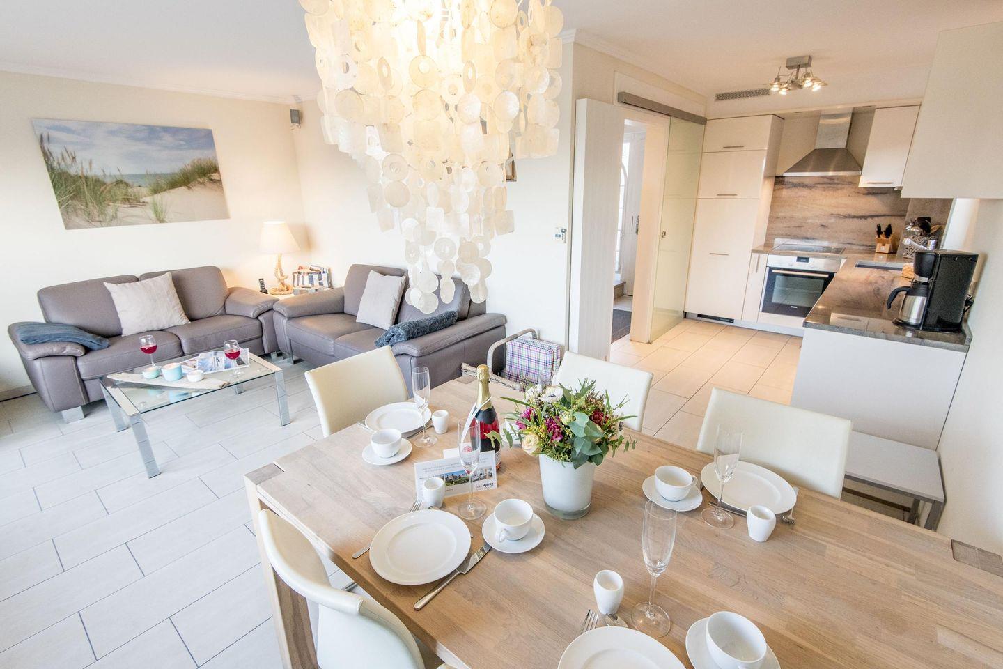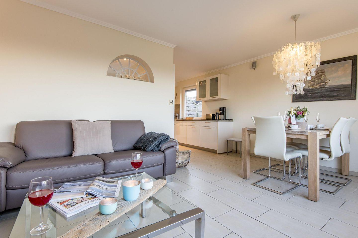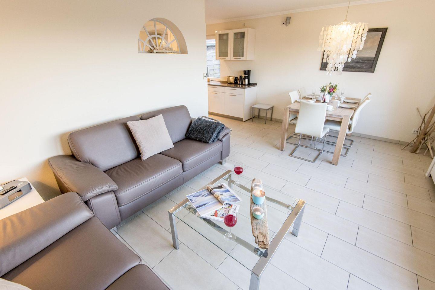 Das stilvolle Wohnzimmer ist mit einem komfortablen Sofa und hochwertigen Möbeln ausgestattet. Eine große Fensterfront bietet einen traumhaften Ausblick über die Heide und sorgt für eine lichtdurchflutete Atmosphäre. Vom Wohnzimmer aus haben Sie direkten Zugang zur großzügigen, möblierten Westterrasse, die perfekt ist, um die Abendsonne zu genießen.