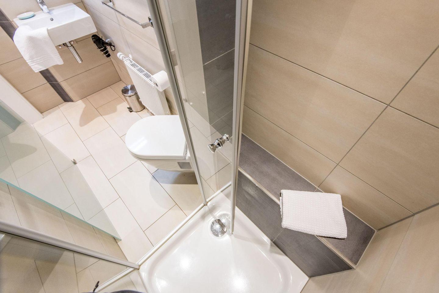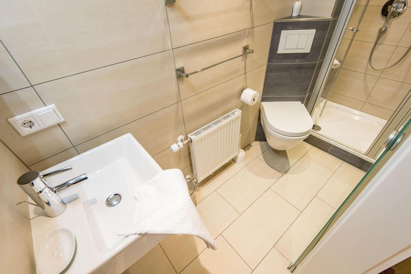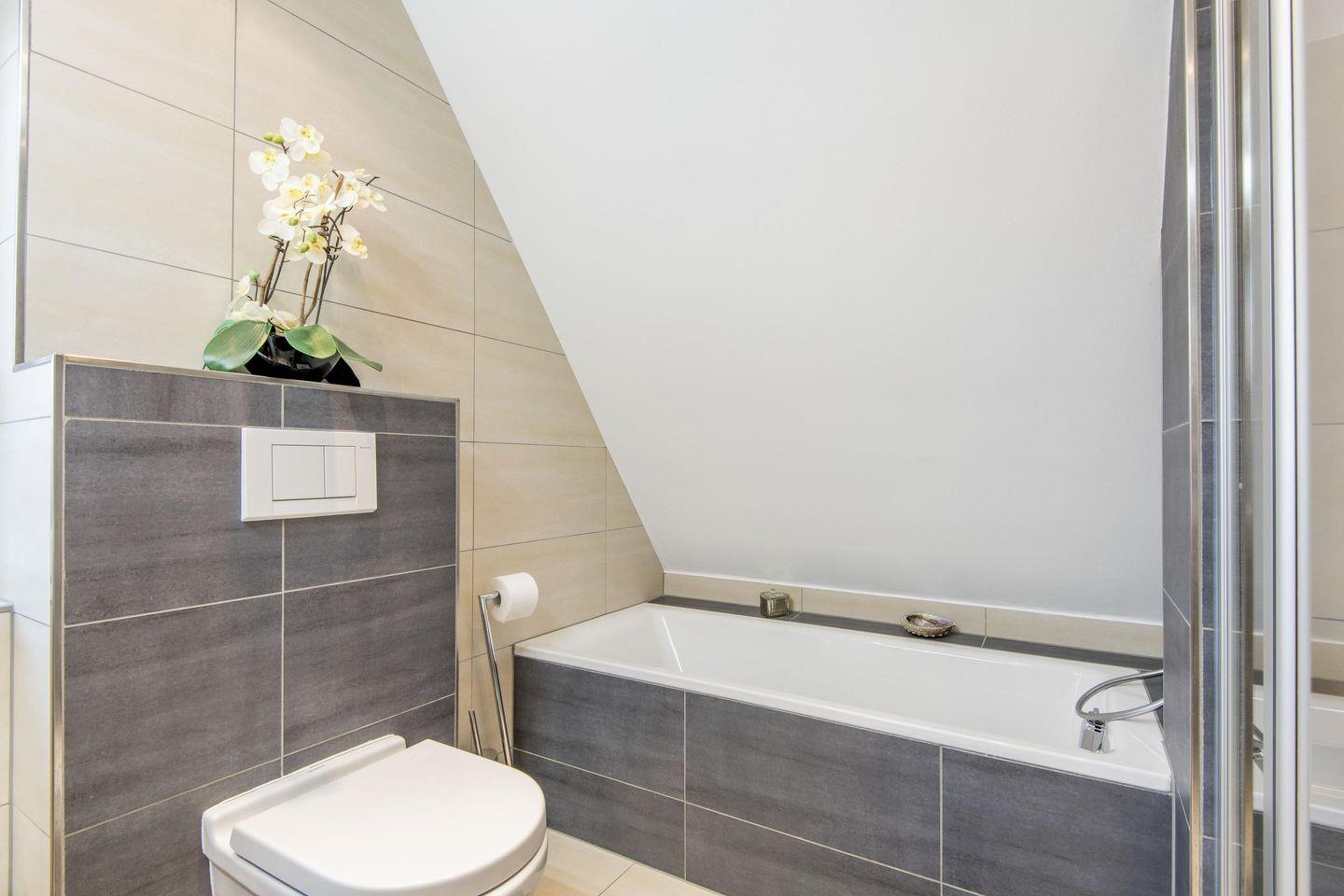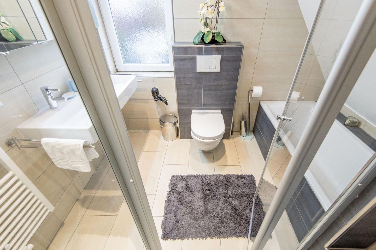 Das erste Badezimmer bietet eine Dusche, WC und Tageslicht, während das zweite Badezimmer mit einer Badewanne und einer Dusche ausgestattet ist – perfekt für entspannende Momente nach einem erlebnisreichen Tag.