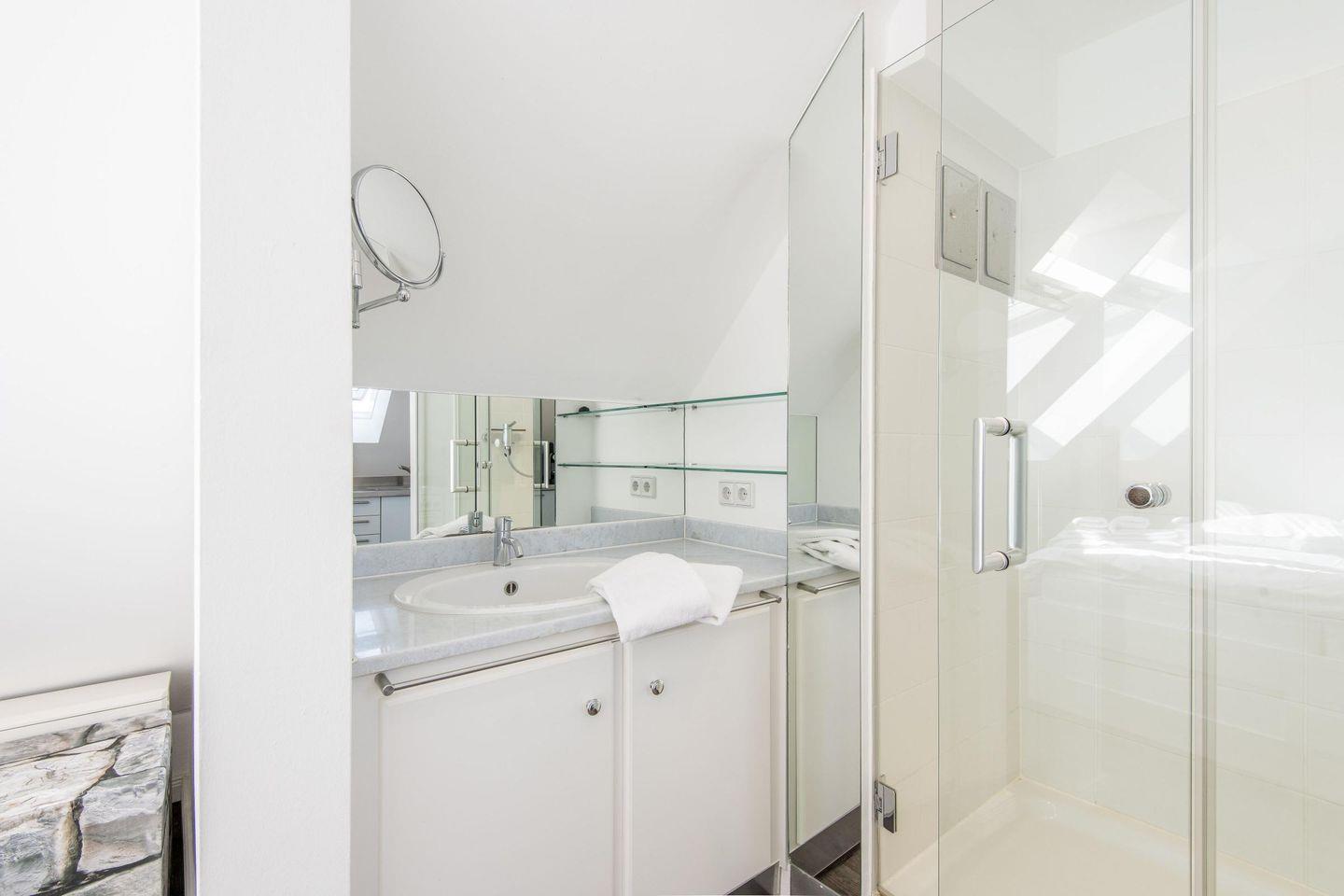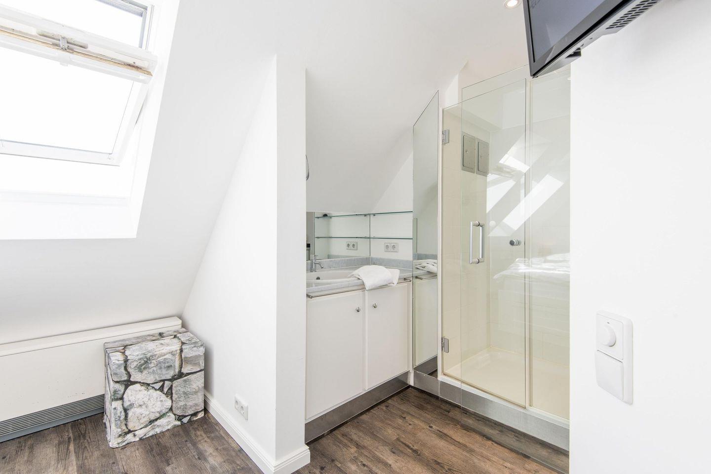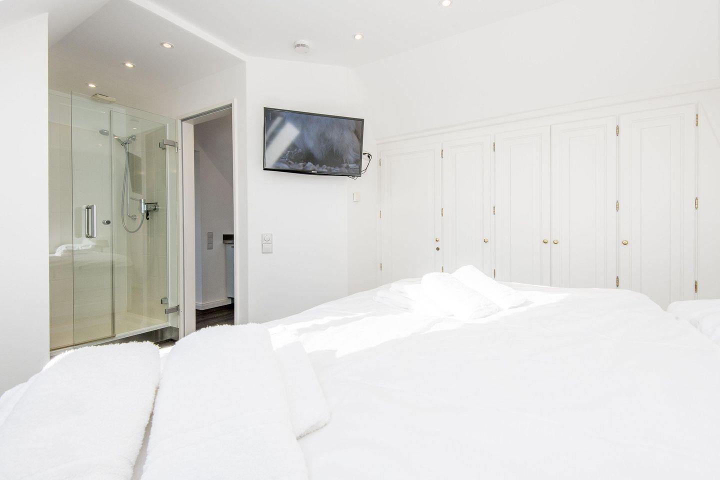 Das Schlafzimmer ist mit einem komfortablen Doppelbett (2x 90x200 cm) und einem geräumigen Einbauschrank ausgestattet, der viel Platz für Ihre Garderobe bietet. Ein zusätzlicher TV im Schlafzimmer sorgt für entspannte Abende im Bett. Direkt an das Schlafzimmer angeschlossen befindet sich das En-Suite-Badezimmer mit Dusche, Tageslicht und Föhn – hier können Sie den Tag erfrischt beginnen.