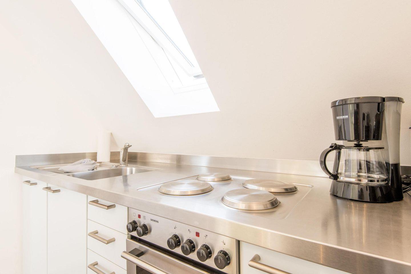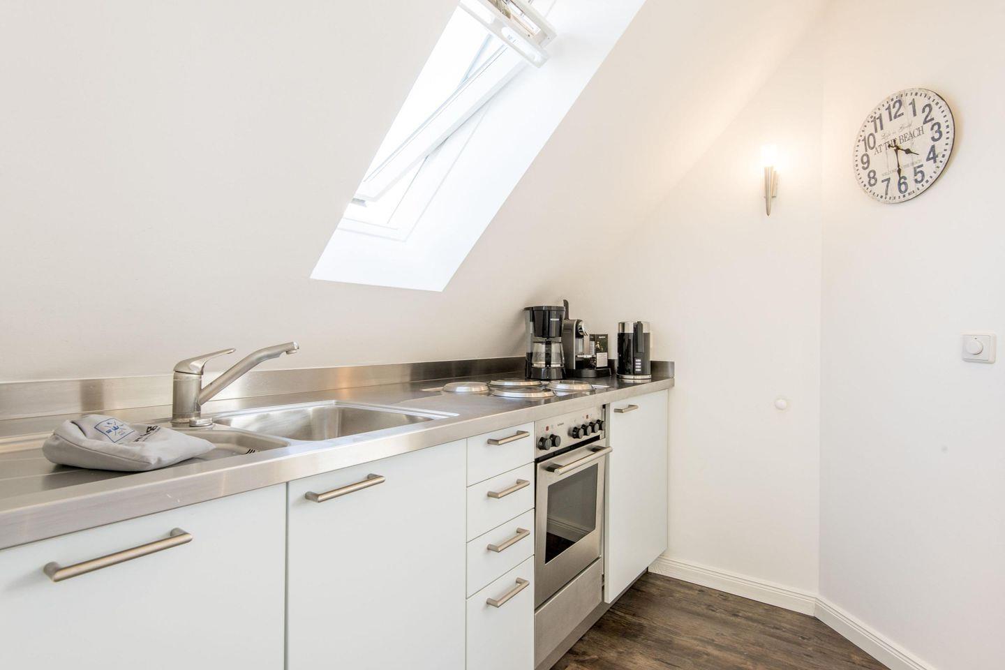 Die halboffene Pantry-Küche ist kompakt, aber funktional eingerichtet. Mit einem 4-flammigen Herd, einer Krups Nespresso-Maschine und allen notwendigen Küchenutensilien ausgestattet, bietet sie viel Komfort für die Zubereitung kleinerer Mahlzeiten. Der angrenzende Essbereich ist ideal für ein gemütliches Frühstück oder ein Abendessen zu zweit.