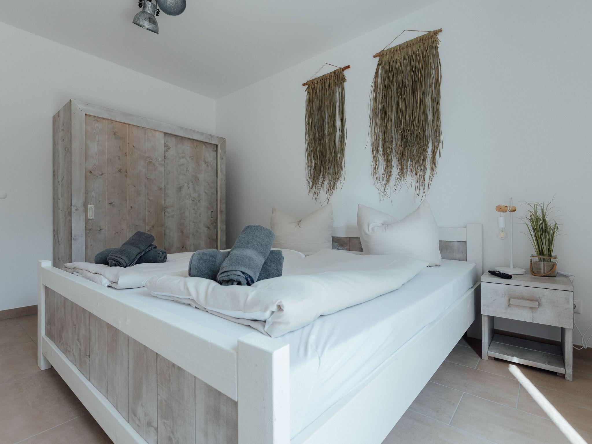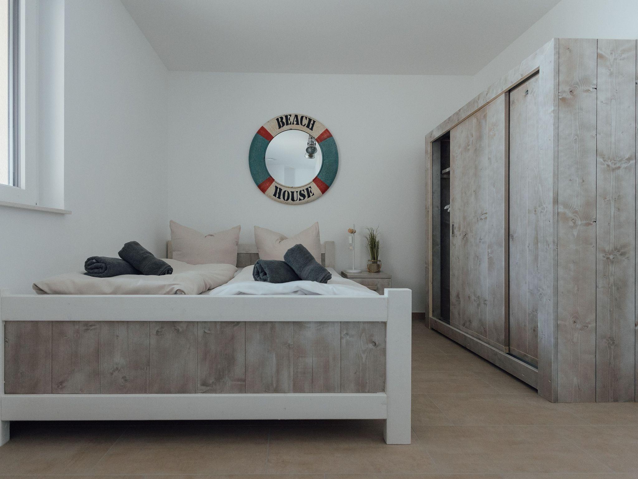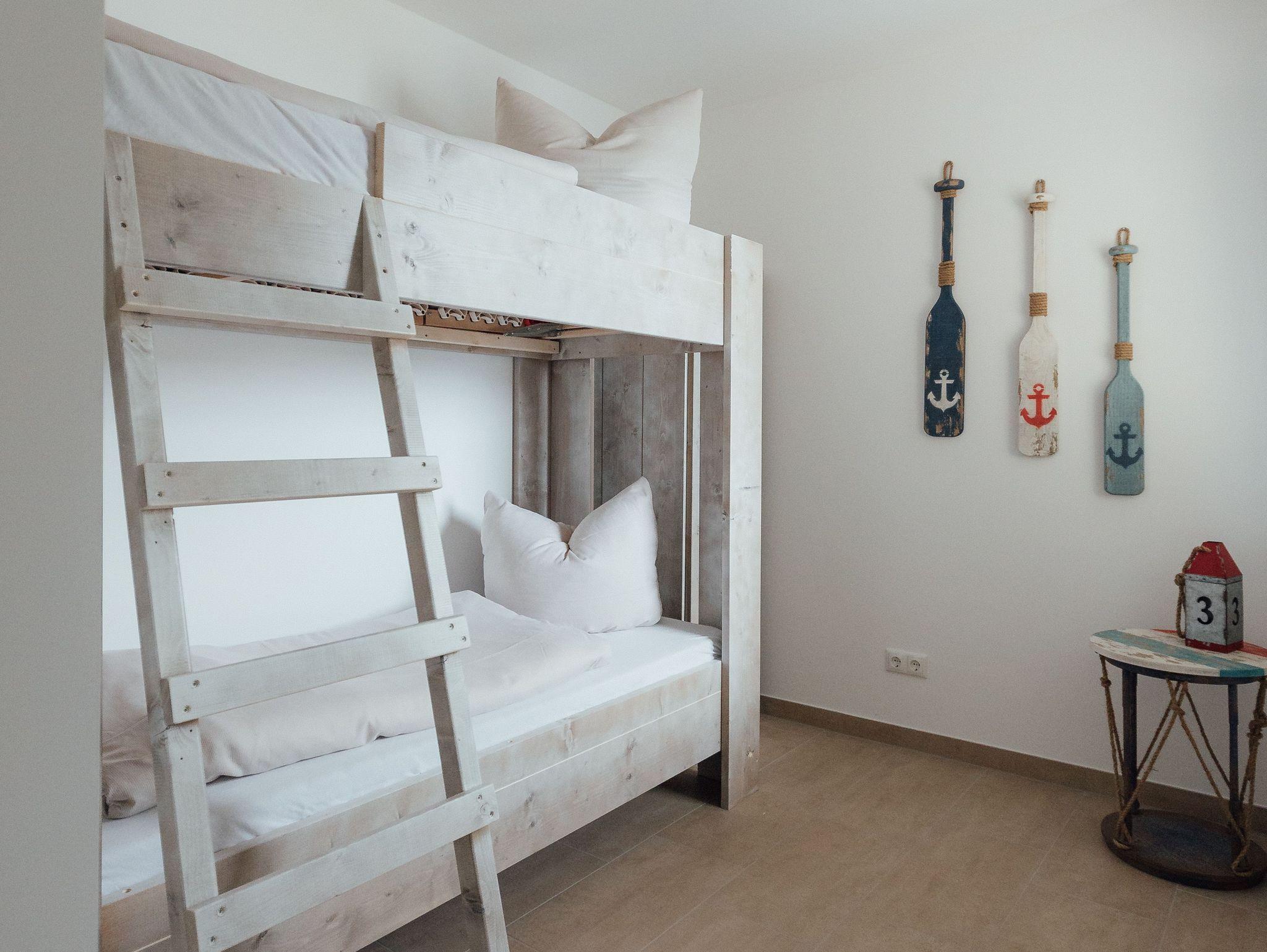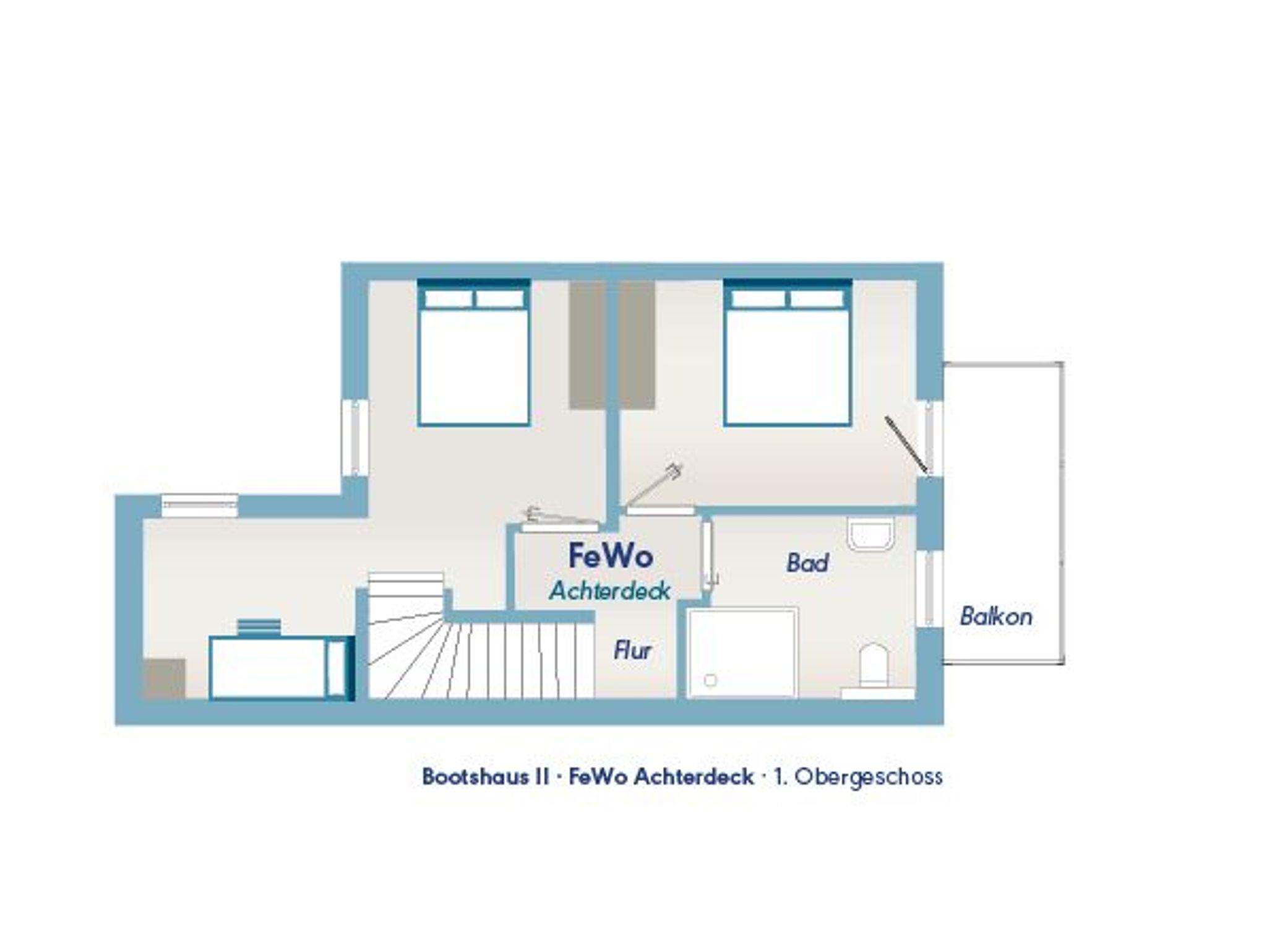 Die Ferienwohnung Achterdeck bietet Platz für bis zu sechs Personen. Sie ist auf zwei Etagen aufgeteilt. Im Erdgeschoss gibt es einen offenen Wohn- und Küchenbereich mit Essplatz und Zugang zur Terrasse. In der oberen Etage befindet sich ein separates Schlafzimmer mit einem Doppelbett sowie ein zweites separates Schlafzimmer mit einem Doppelbett und einem Etagenbett, das zwei Meter lang ist und in dem auch Erwachsene schlafen können. In der oberen Etage gibt es zudem das Badezimmer mit Dusche und WC. Zur Ferienwohnung gehört ein Balkon. Die Betten des Etagenbettes haben jeweils eine Größe von 80x200 cm.