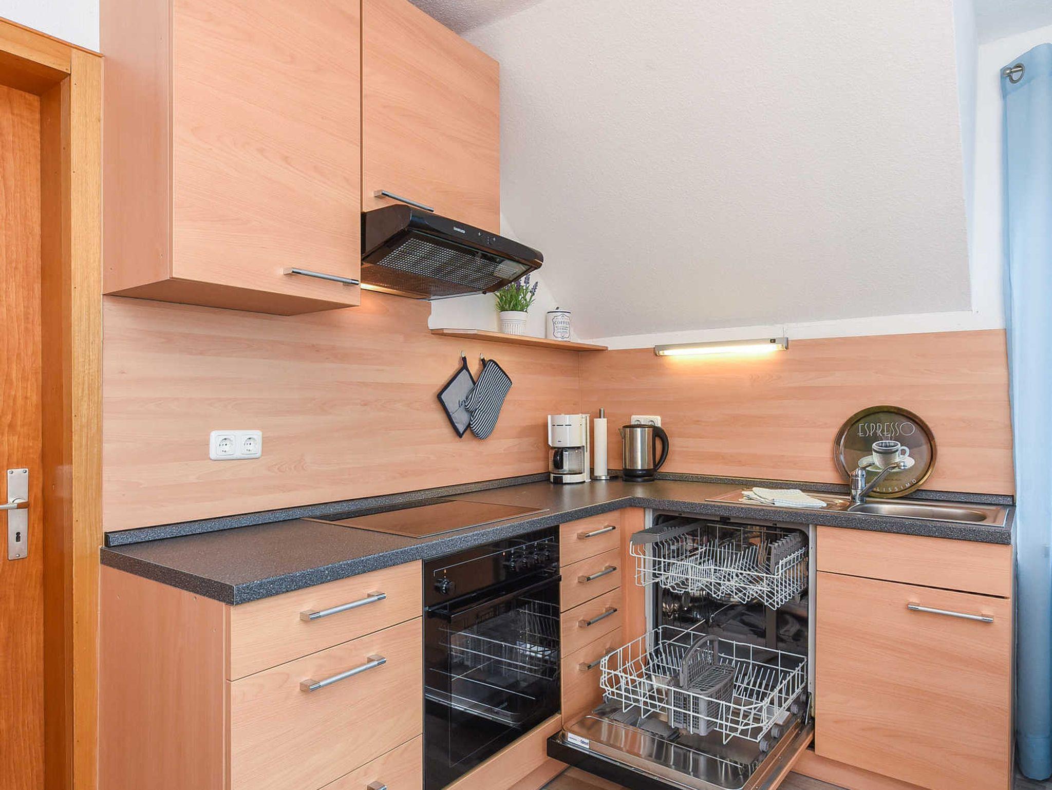 Größe ca. 60 Quadratmeter, Wohnraum mit integrierter Küche, Schlafzimmer, zweites separates Schlafzimmer/Kinderzimmer, Badezimmer mit Dusche, Waschtisch und WC, Obergeschoss, Terrasse im Garten, Balkon, optimal für 2 bis 4 Personen und zusätzlich ein Kleinkind.