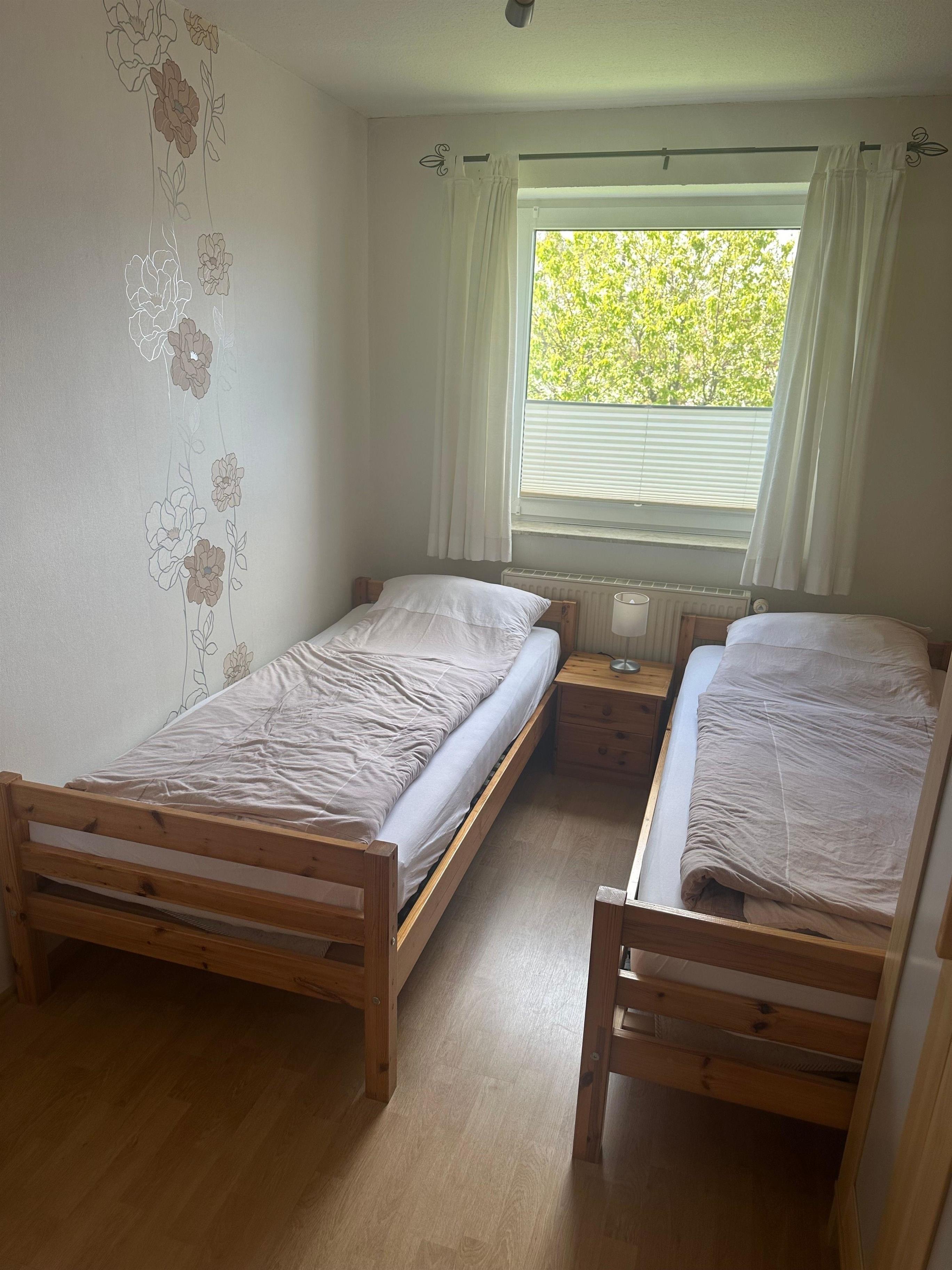 Unsere modern und gemütlich eingerichtete Ferienwohnung bietet Platz für bis zu 4 Personen. Die Wohnung verfügt über 2 Schlafzimmer. Eines davon mit einem Doppelbett und einem großen Schrank. Das andere Schlafzimmer ist mit 2 Einzelbetten ausgestattet.