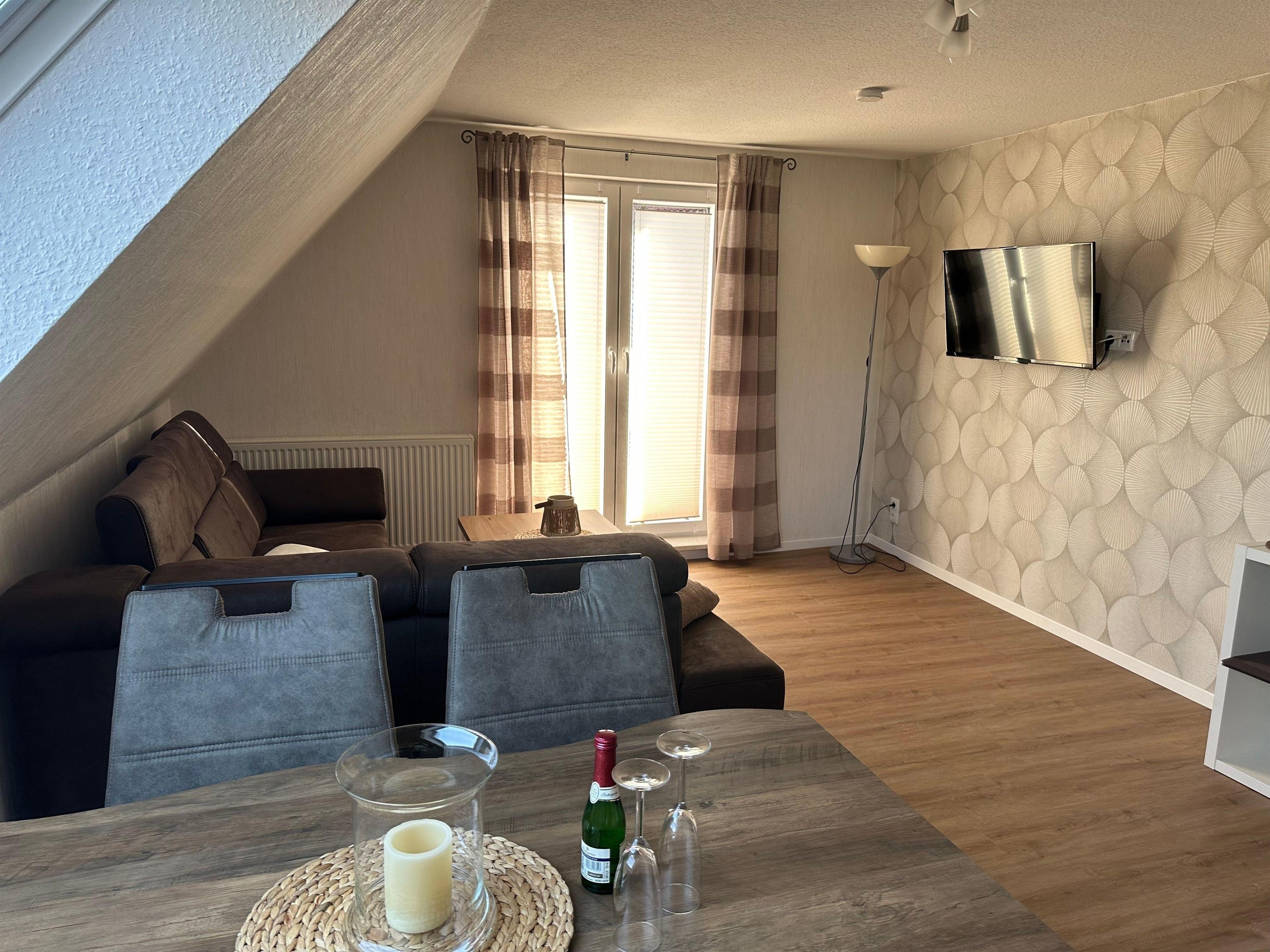 Unsere gemütliche Ferienwohnung wurde 2025 neu renoviert. Der Wohn-/ Essbereich ist mit einer hochwertigen Küchenzeile ausgestattet. Am Esstisch finden 4 Personen Platz.
