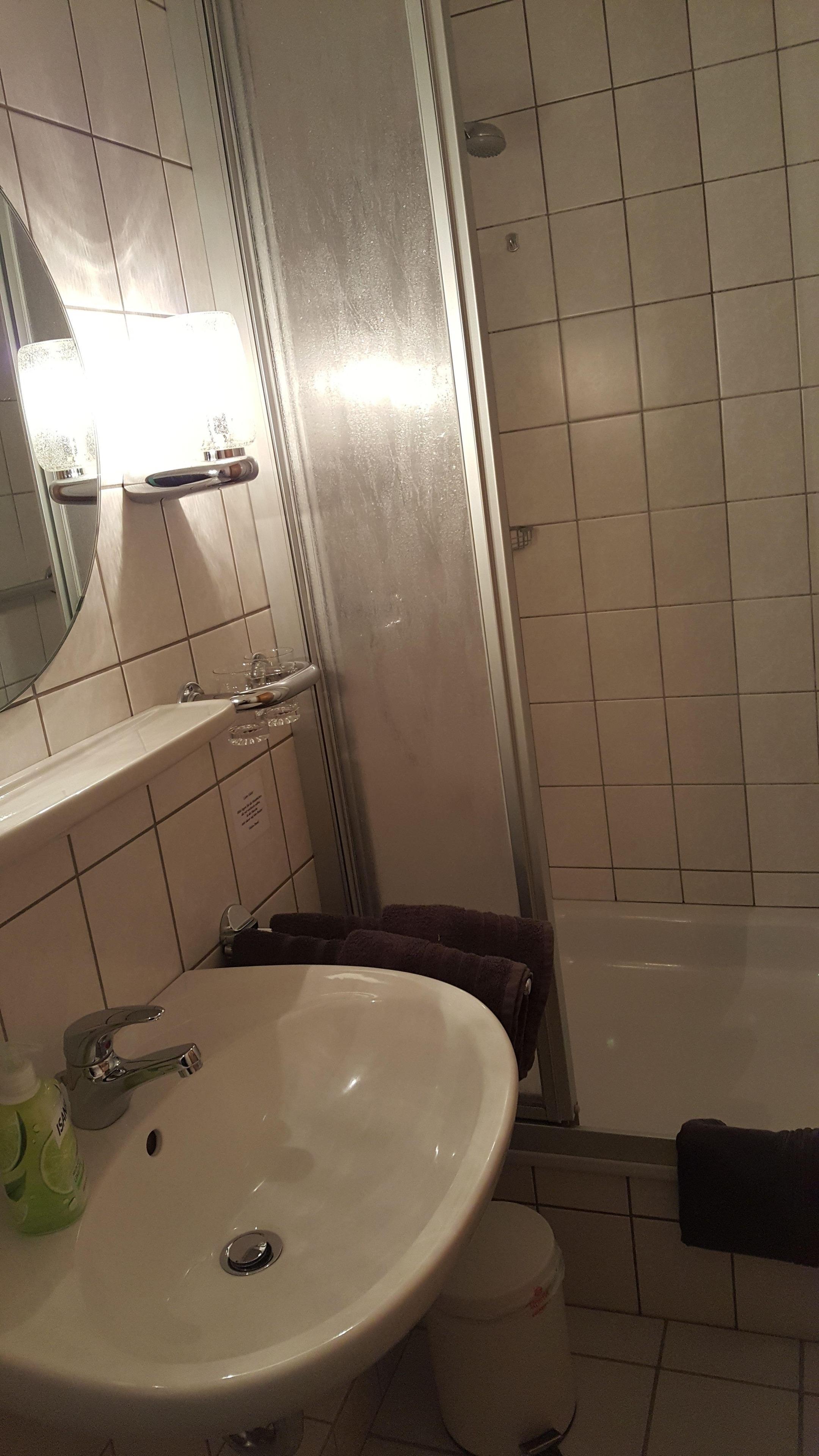 Im Badezimmer befinden sich Dusche, Waschbecken und WC, sowie Handtücher und ein Föhn.