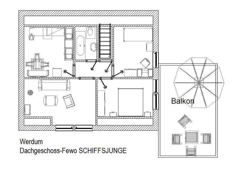 Endlich Urlaub! Dachgeschoss-Ferienwohnung SCHIFFSJUNGE mit großem Balkon im Luftkurort Werdum. In dieser Ferienwohnung finden Sie ein Wohnzimmer, eine Küche mit Essplatz, 2 Schlafräume, Badezimmer und einen sehr großen Balkon.