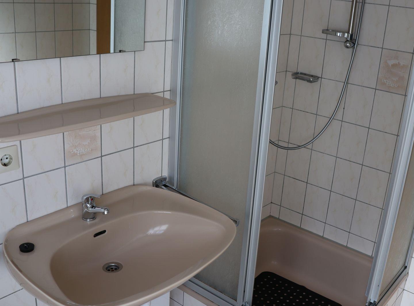 ein großzügiges Wohnzimmer mit offener, voll ausgestatteter Küche, sowie ein helles Badezimmer mit Dusche und WC.