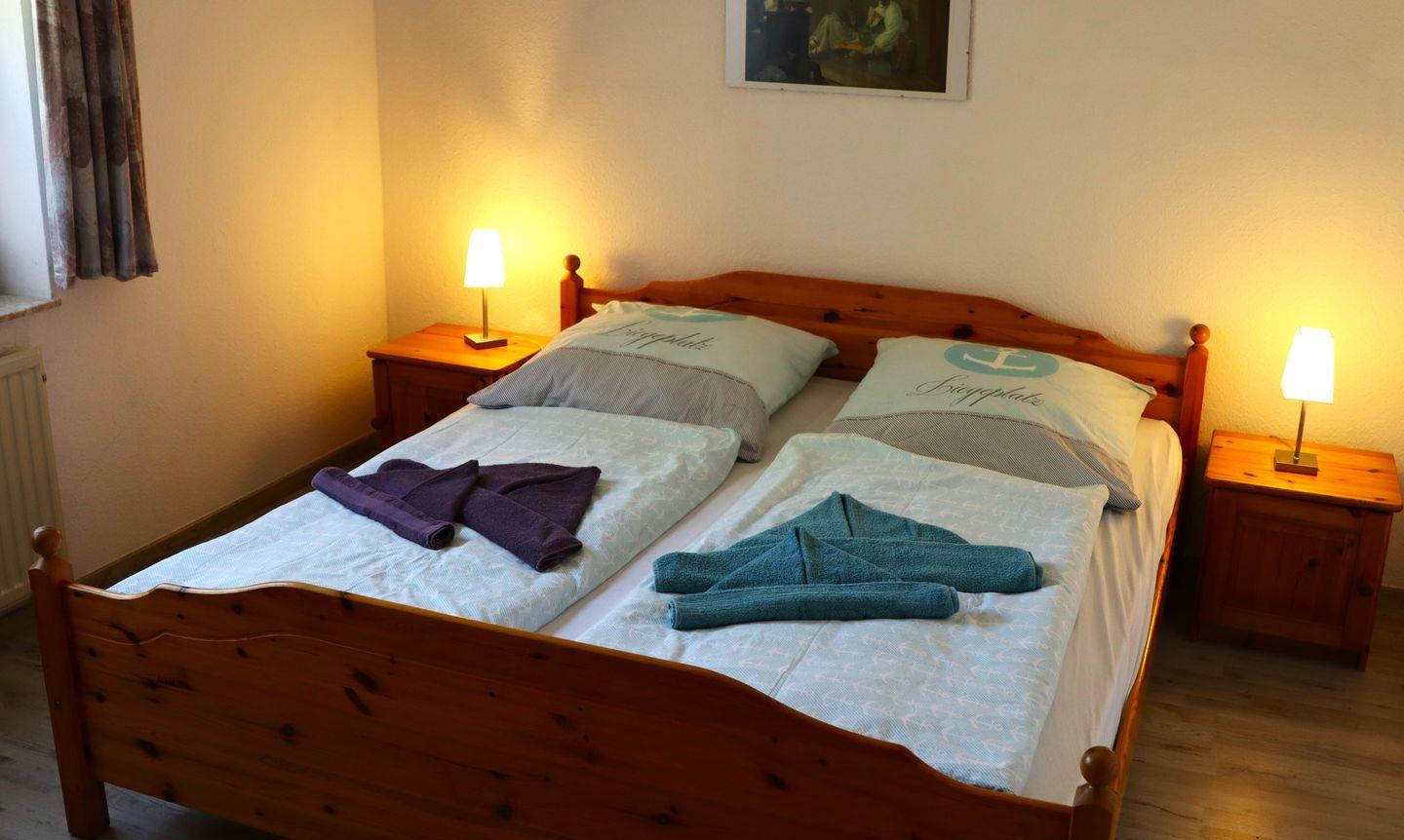 ein behagliches Schlafzimmer mit großem Doppelbett,