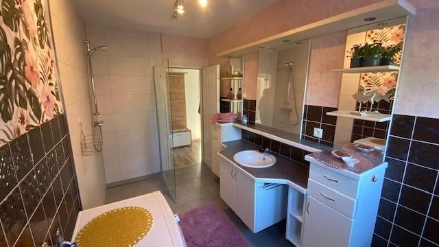 Die im Obergeschoß befindliche Ferienwohnung hat ein großes Wohnzimmer mit TV und großen Esstisch,