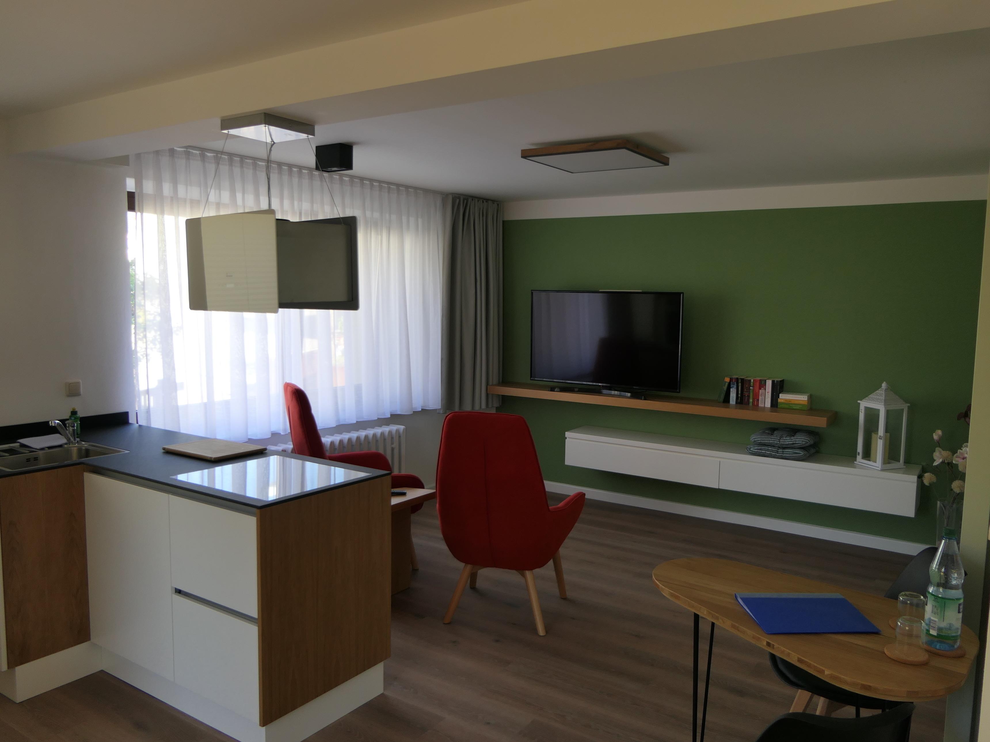 Die offene Küche mit Ihrem Wohn- und Essbereich schließt an das Schlafzimmer an. Die Küche ist mit allen notwendigen Elektrogeräten ( Induktionskochfeld, Backofen, Geschirrspüler, Kühlschrank mit Gefrierfach, sowie Kaffeemaschine, Wasserkocher und Toaster) ausgestattet. Neben diesen Geräten finden Sie auch Geschirr und die benötigten Kochutensilien in unserer Küche vor.