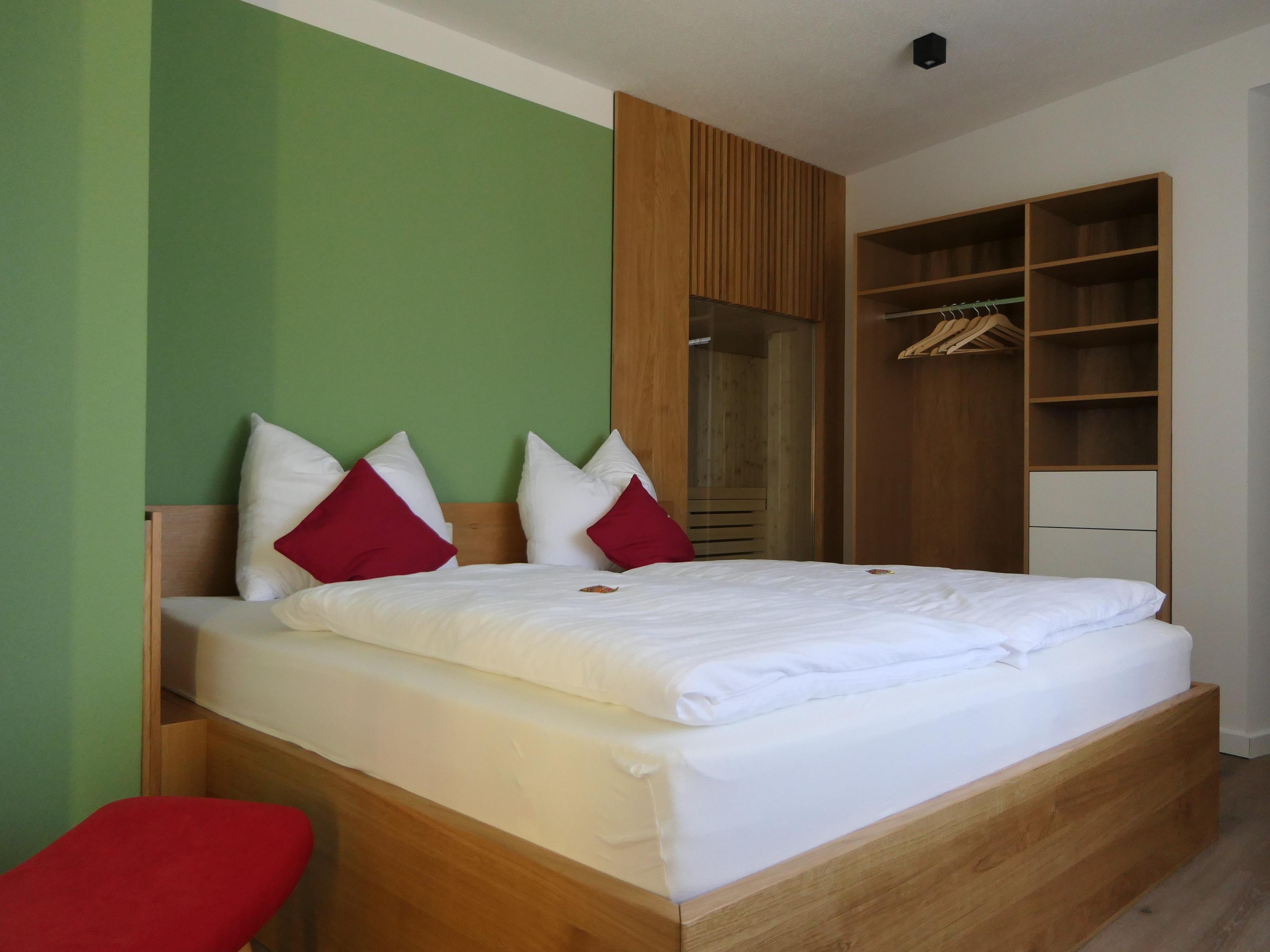 Das helle und freundliche Schlafzimmer ist mit einem Kingsize Bett, sowie einem Schrank mit Safe ausgestattet.