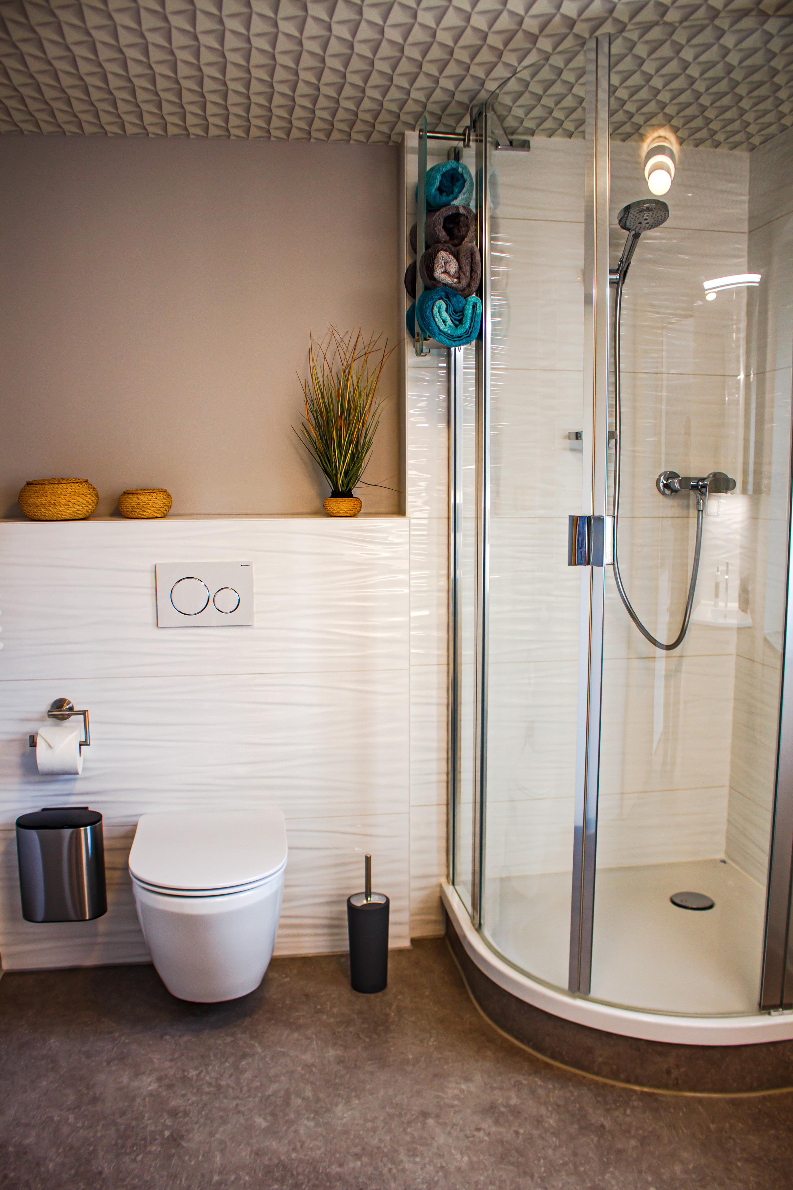 Das moderne Tageslichtbad verfügt über Dusche, Waschtisch, WC und Handtuchheizkörper.