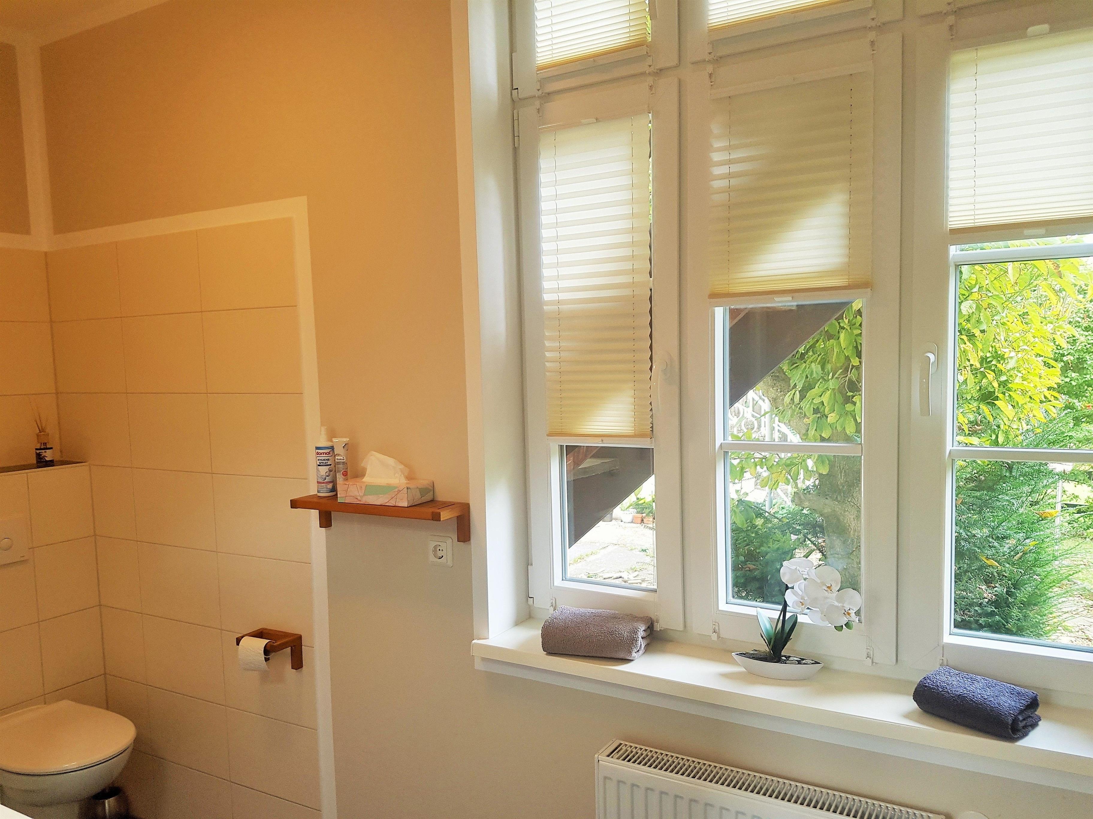 - helles Bad mit ebenerdiger Dusche und WC, Waschbecken, Kosmetikspiegel + Tücher, Fön und vielen Ablageflächen,