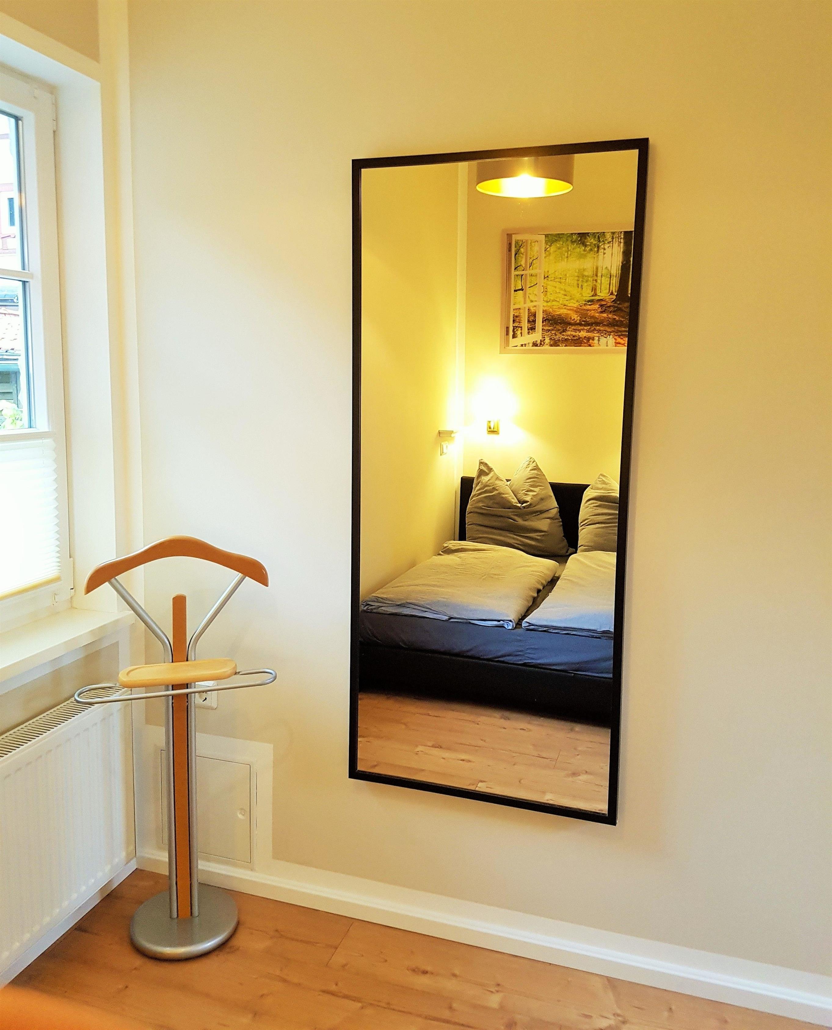 - Schlafzimmer mit Boxspringbett, Ablage, Kommode, Kleiderständer & großem Spiegel