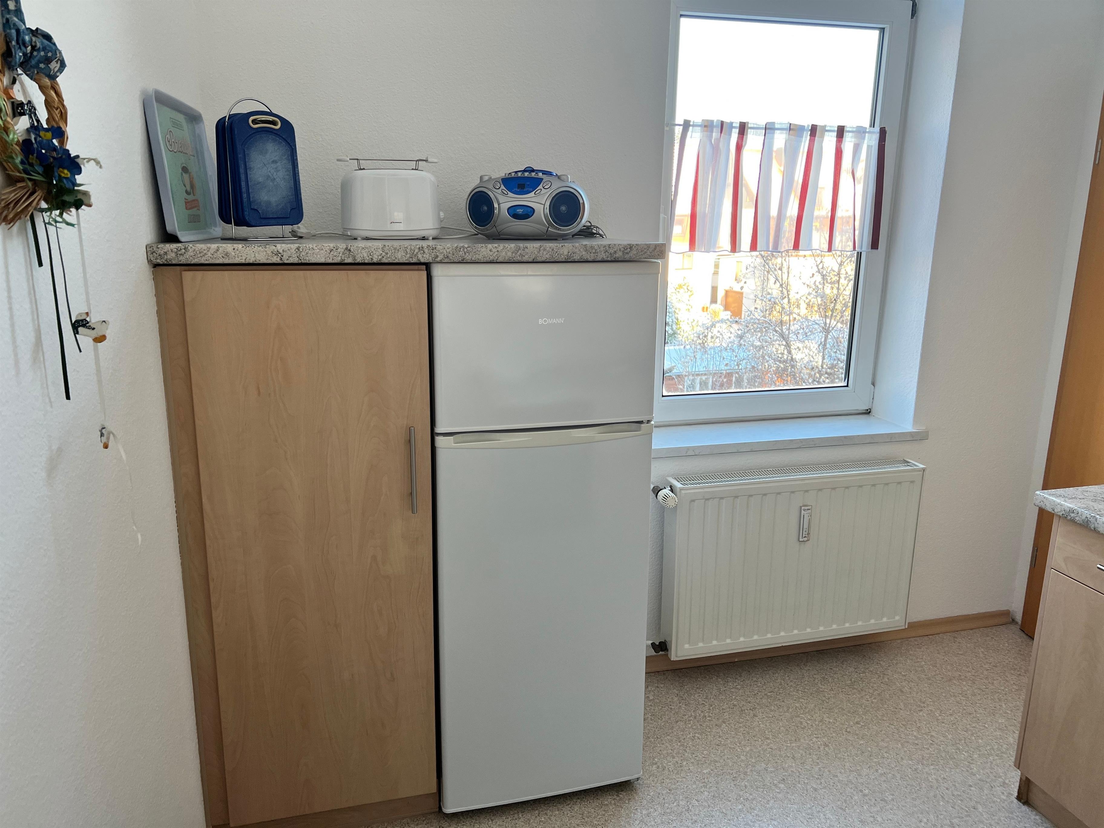 Es ist ein großer Kühlschrank und ein extra Tiefkühlaufsatz vorhanden.