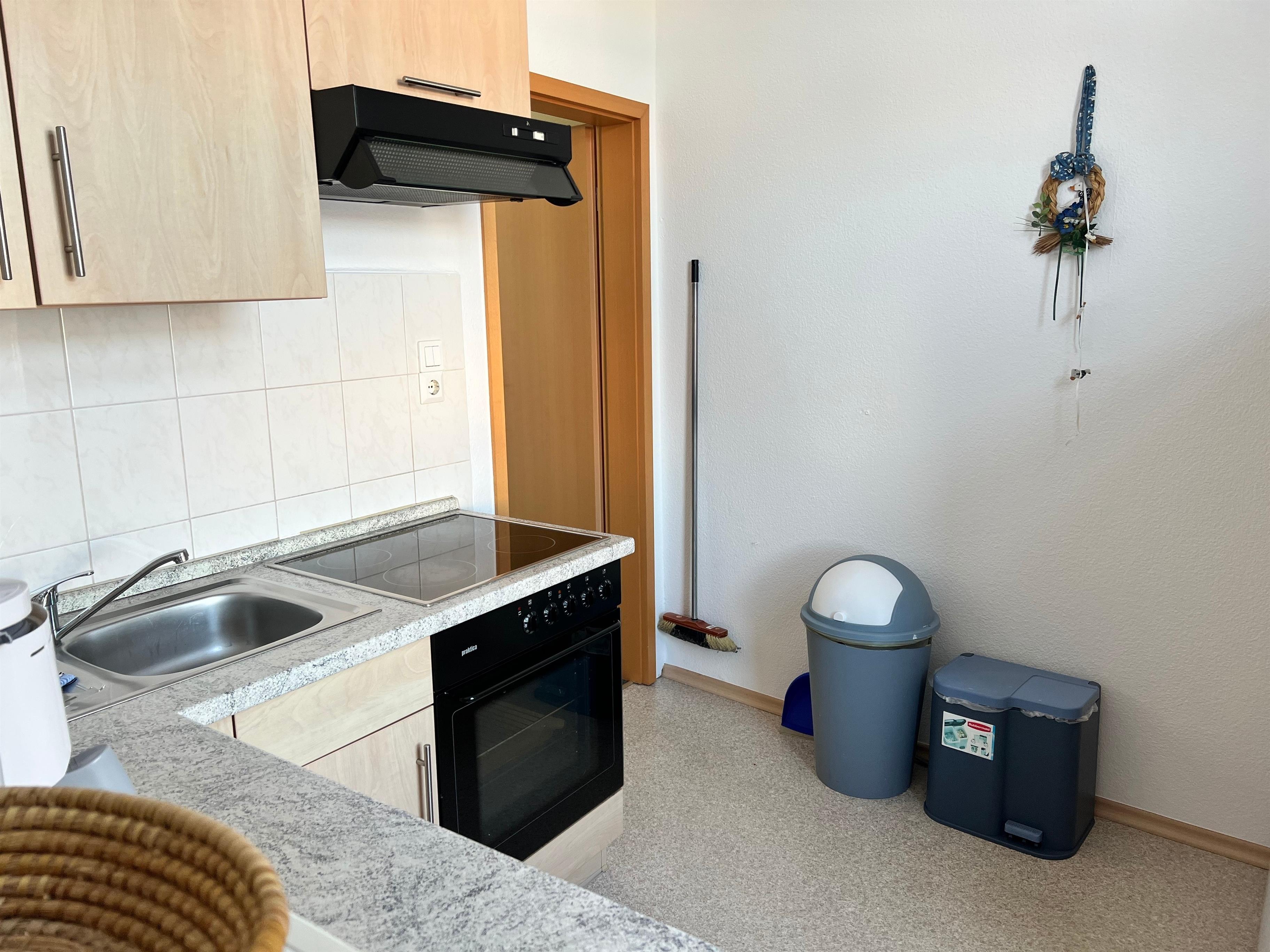 Der Herd hat ein Cerankochfeld und einen Backofen.