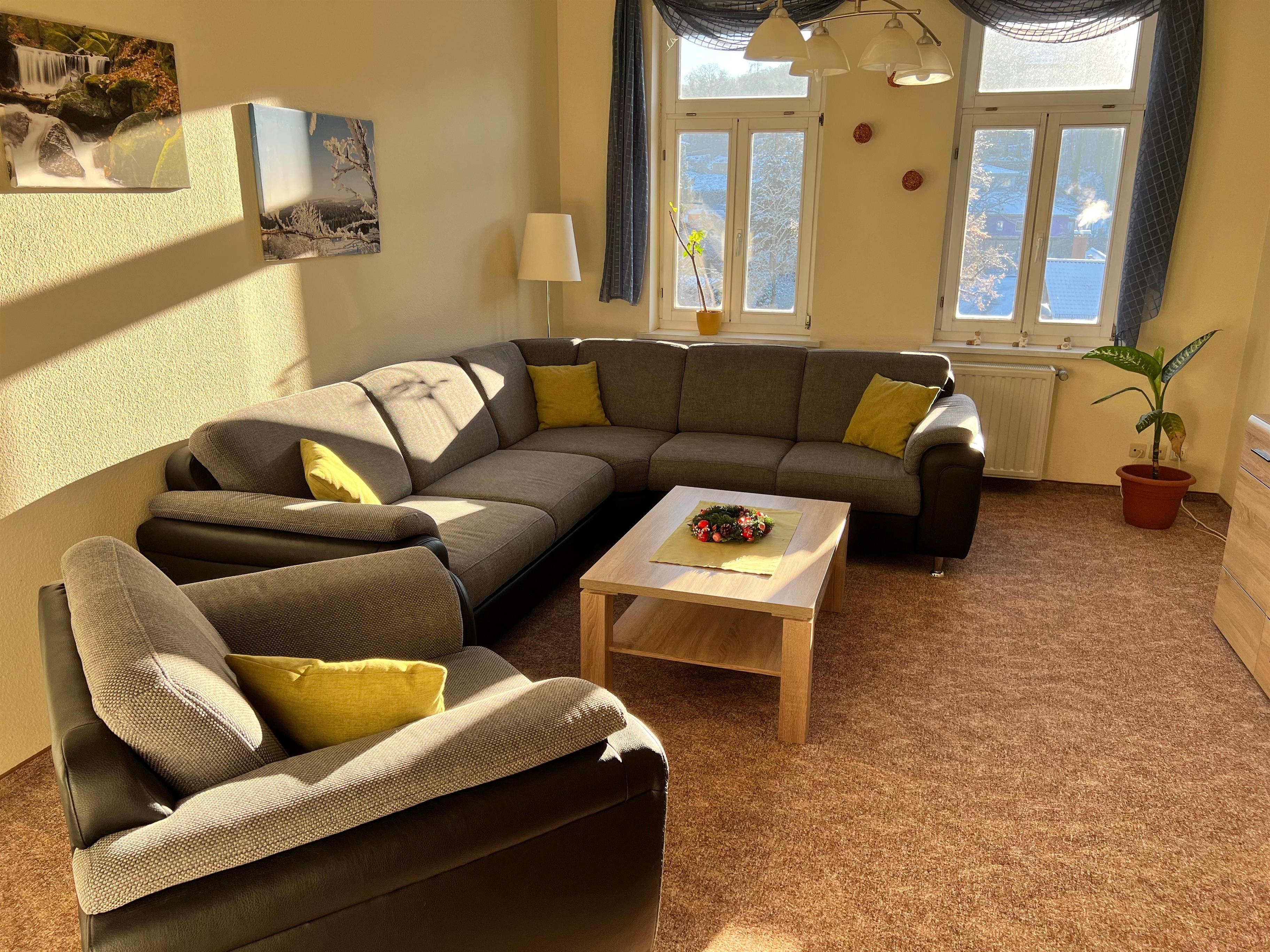 Die Ferienwohnung hat eine Größe von 110 qm. Ein Wohnzimmer mit großer Eckcouch und Sessel hat eine Größe von ca. 24 qm.