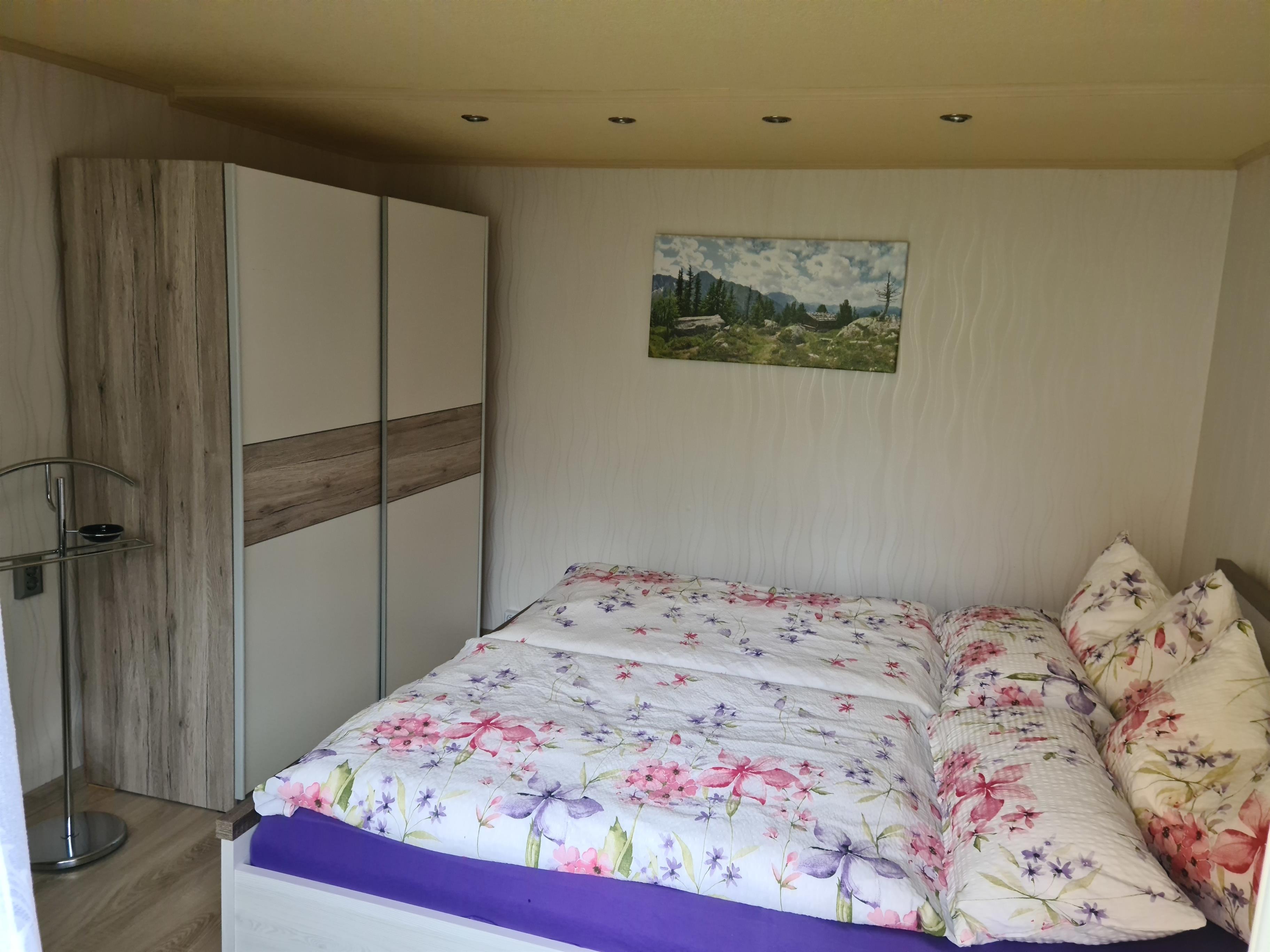 Das Schlafzimmer mit Doppelbett, großem Kleiderschrank, Möglichkeit für eine Aufbettung im Wohnzimmer auf der Schlafcouch. Der Bungalow ist für 2 Erwachsene geeignet, Aufbettung für eine weitere Person nur auf persönliche Anfrage bei dem Vermieter.