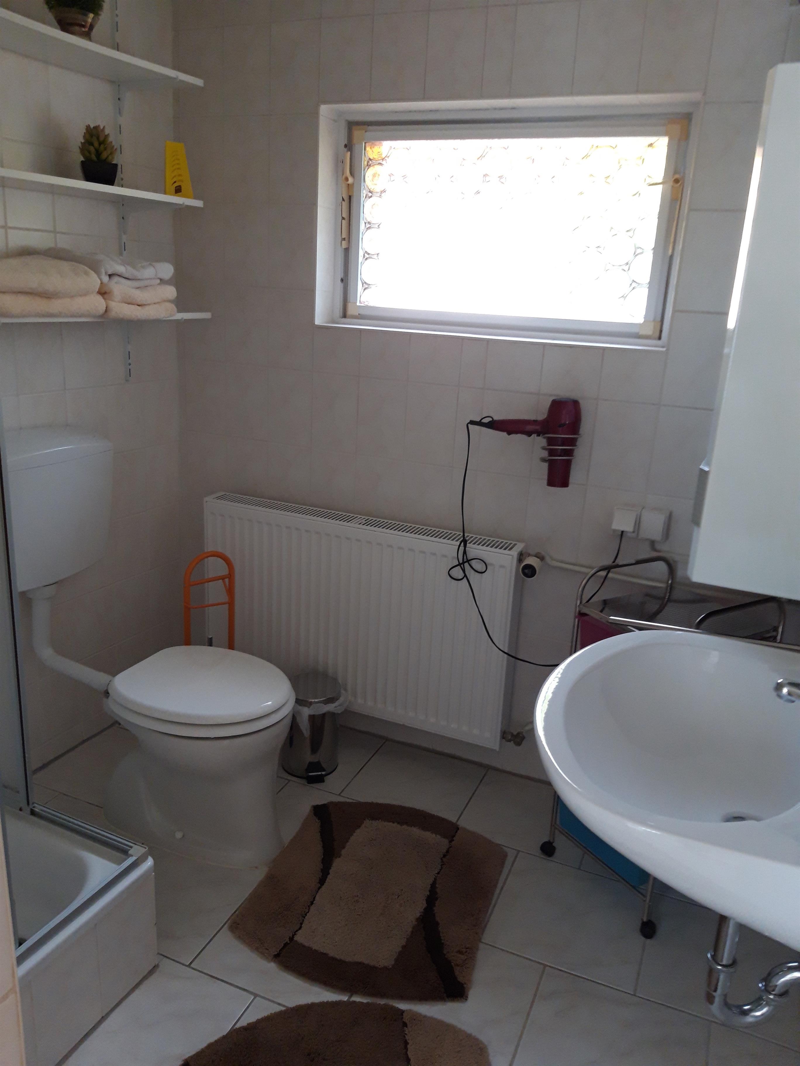 Bad mit Dusche, Waschbecken, WC, Fön, Kosmetikspiegel.