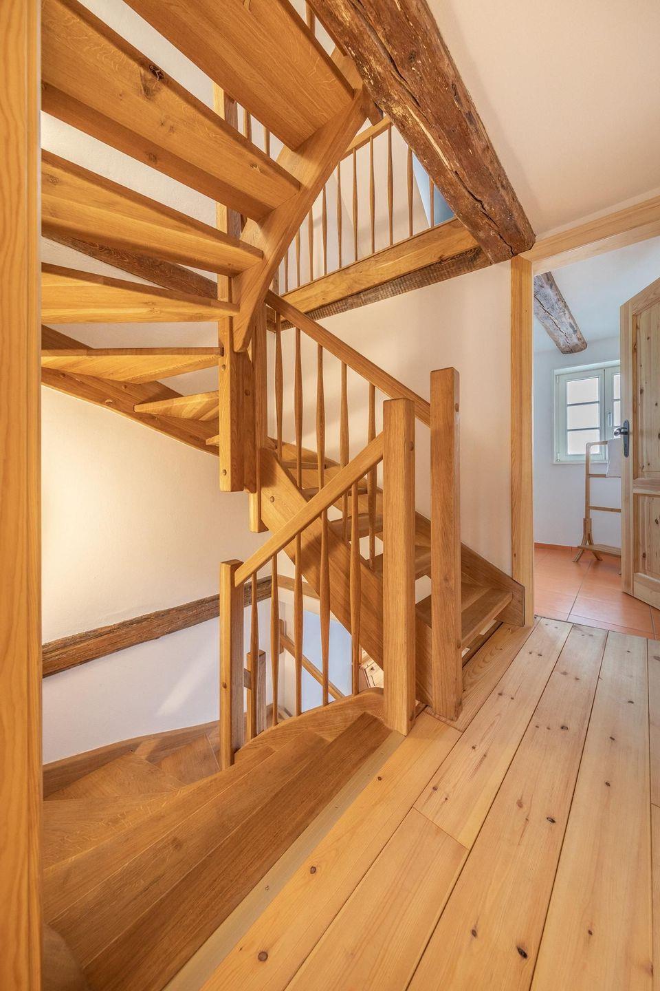 Über eine massive Echtholztreppe geht es in beiden Häusern die obere Etage. Im Haus
