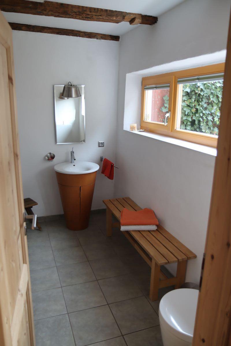 Im Erdgeschoss befindet sich eine Wohnküche mit Bank und Stühlen. Die Küche ist ausgestattet mit Herd, Backofen, Kühlschrank, Mikrowelle und Geschirrspüler. Ferner finden Sie im Erdgeschoss ein Badezimmer mit Badewanne/Dusche, WC, Waschbecken und Fußbodenheizung. Nebenan befindet sich ein weiterer Raum mit WC und Waschbecken. Vom Flur geht es direkt in den Innenhof, wo Sie Gartenmöbel zum Verweilen und Entspannen finden.