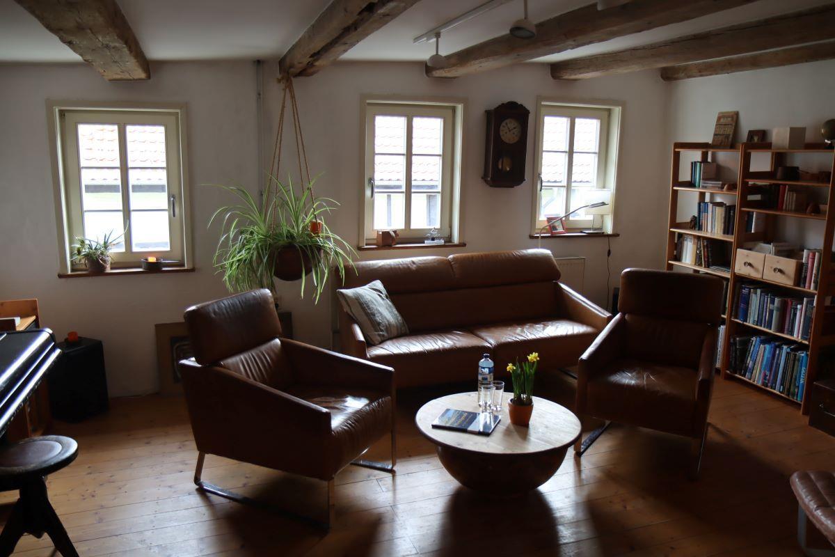 Über eine Echtholztreppe gelangen Sie in die obere Etage mit einem Wohnzimmer und einem Schlafzimmer für 2 Personen. Das Wohnzimmer verfügt über Ledersessel und Ledercouch sowie einen Flachbild-TV.