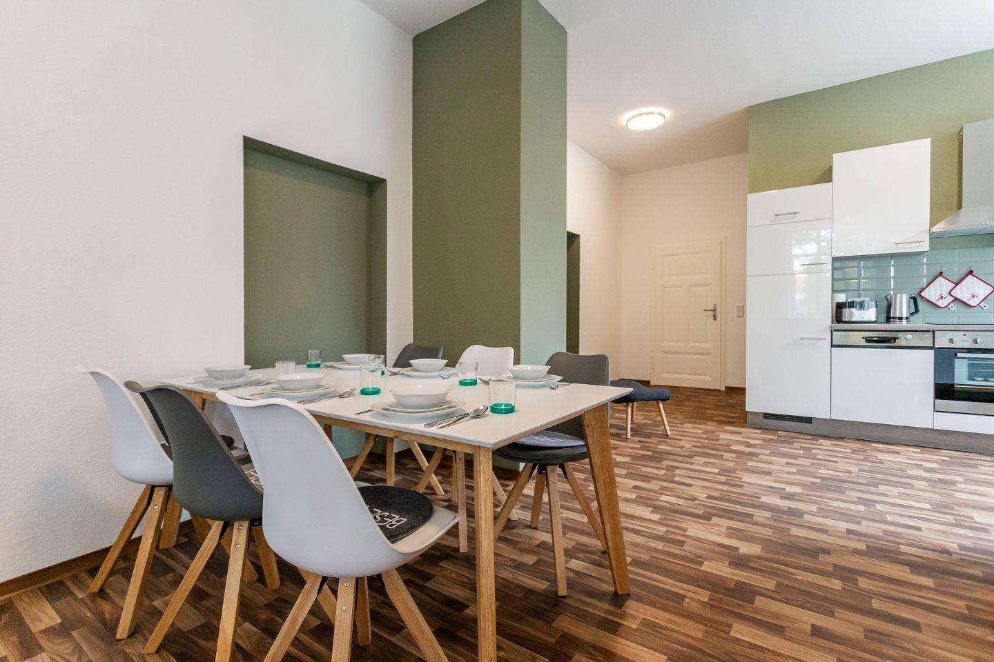 Wohnung 2: Die grüne Ferienwohnung verfügt über zwei Schlafzimmer mit jeweils einem Doppelbett, ein Wohnzimmer und eine voll ausgestattete Küche mit Essbereich. Auch diese Wohnung verfügt über ein sehr schönes Bad. Zur Wohnung gehört auch ein kostenloser Parkplatz direkt hinter dem Haus.
