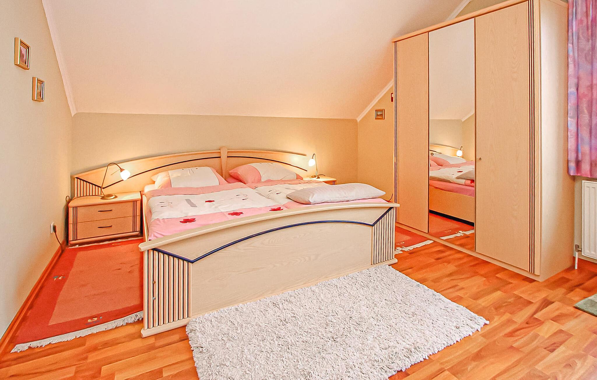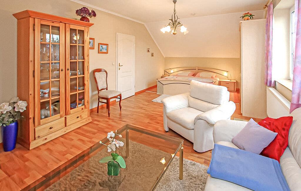 Ferielejligheden ligger sammen med to andre ferielejligheder på en velholdt, 3000 kvadratmeter stor bolig- og naturejendom direkte ved forbindelseskanalen mellem Ellenbogensee og Pälitzseen. Travl skibstrafik i løbet af sæsonen giver mange interessante oplevelser blot ved at observere dem. Lejligheden har direkte adgang til kanalen. Svømning er muligt ved Großer Pälitzsee omkring 150 meter væk. Der kan benyttes flere udendørs siddepladser, et område til solbadning, en grill, et centralt vaskerum, et fællesrum, et cykelrum og en parkeringsplads. Ferielejligheden er beliggende separat på øverste etage i bolig- og sommerhuset. Den er indrettet med kombineret stue/soveværelse med polstrede møbler, dobbeltseng, TV, radio, køkken med el-komfur med ovn, køleskab med fryser, mikroovn, spiseplads og diverse køkkenmaskiner samt badeværelse med bruser og toilet. . Der er også centralvarme og en barneseng, der kan tilføjes. Følgende ydelser er inkluderet i den samlede pris: slutrengøring, sengelinned, håndklæder, vand og energi. Betales på stedet: spaskat (april-oktober). Strasen er et feriested midt i Mecklenburgs lille sølandskab, cirka 8 km syd for Wesenberg. Dette område imponerer med sin originalitet og sine mange søer, som er forbundet med hinanden ved at forbinde kanaler, hvoraf nogle er rustikke. Især vandvandrere, vandsportsentusiaster og lystfiskere finder de bedste forhold her. Takket være det veludbyggede netværk af cykelstier får cyklisterne også noget for pengene. Restaurant, kiosk, båd- og cykeludlejning i byen.
