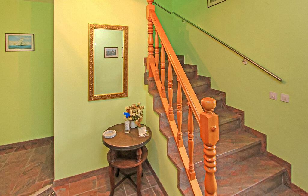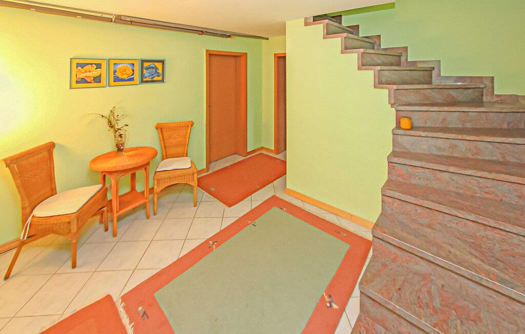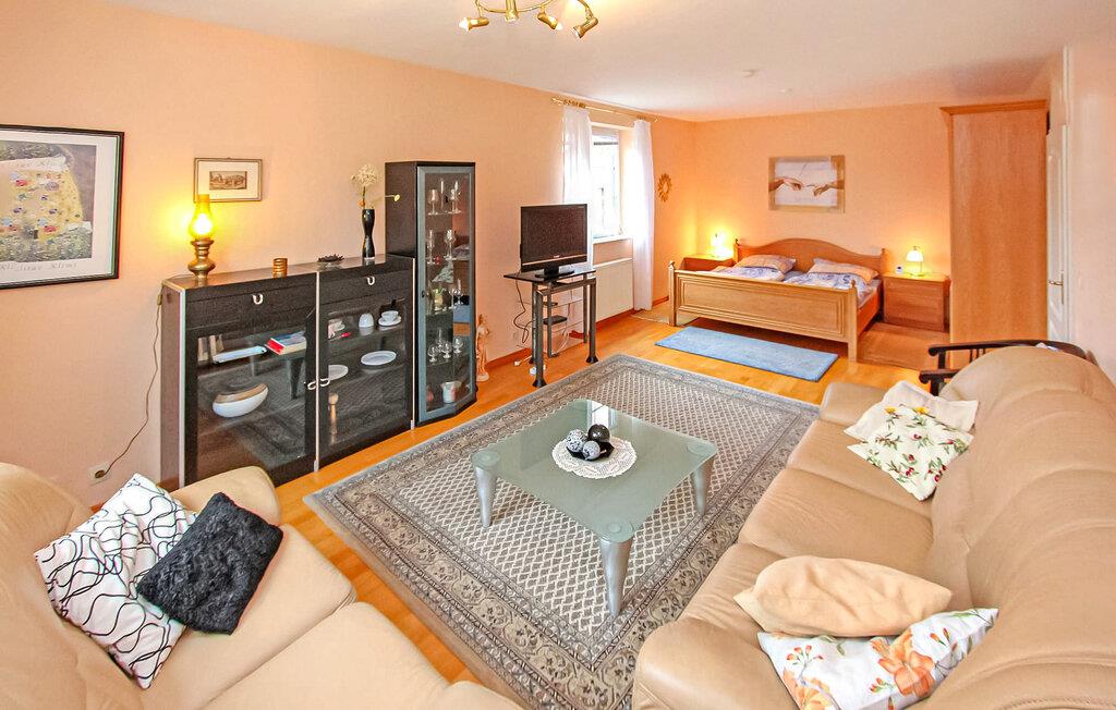 Ferielejligheden ligger sammen med to andre ferielejligheder på en velholdt, 3000 kvadratmeter stor bolig- og naturejendom direkte ved forbindelseskanalen mellem Ellenbogensee og Pälitzseen. Travl skibstrafik i løbet af sæsonen giver mange interessante oplevelser blot ved at observere dem. Lejligheden har direkte adgang til kanalen. Svømning er muligt ved Großer Pälitzsee omkring 150 meter væk. Der kan benyttes flere udendørs siddepladser, et område til solbadning, en grill, et centralt vaskerum, et fællesrum, et cykelrum og en parkeringsplads. Ferielejligheden er beliggende separat på øverste etage i bolig- og sommerhuset. Den har kombineret stue/soveværelse med polstrede møbler, dobbeltseng, TV, radio, køkken (separat udenfor lejligheden i husets kælder med el-komfur med ovn, køleskab med fryser, mikroovn, spisebord og div. køkkenmaskiner) og et badeværelse med bruser og toilet. Lejligheden er desuden udstyret med centralvarme og en barneseng, der kan tilføjes. Følgende ydelser er inkluderet i den samlede pris: slutrengøring, sengelinned, håndklæder, vand og energi. Betales på stedet: spaskat (april-oktober). Strasen er et feriested midt i Mecklenburgs lille sølandskab, cirka 8 km syd for Wesenberg. Dette område imponerer med sin originalitet og sine mange søer, som er forbundet med hinanden ved at forbinde kanaler, hvoraf nogle er rustikke. Især vandvandrere, vandsportsentusiaster og lystfiskere finder de bedste forhold her. Takket være det veludbyggede netværk af cykelstier får cyklisterne også noget for pengene. Restaurant, kiosk, båd- og cykeludlejning i byen.