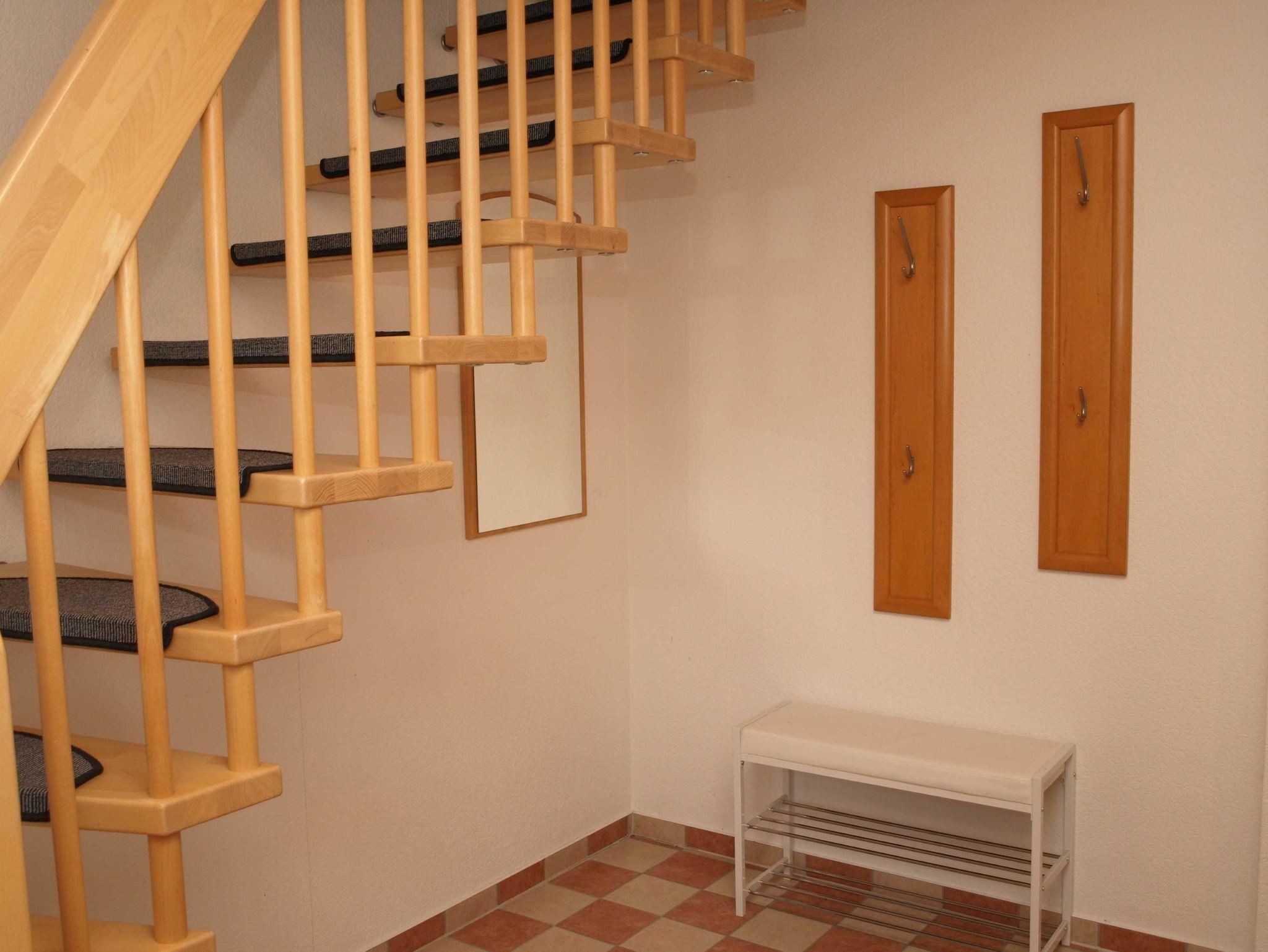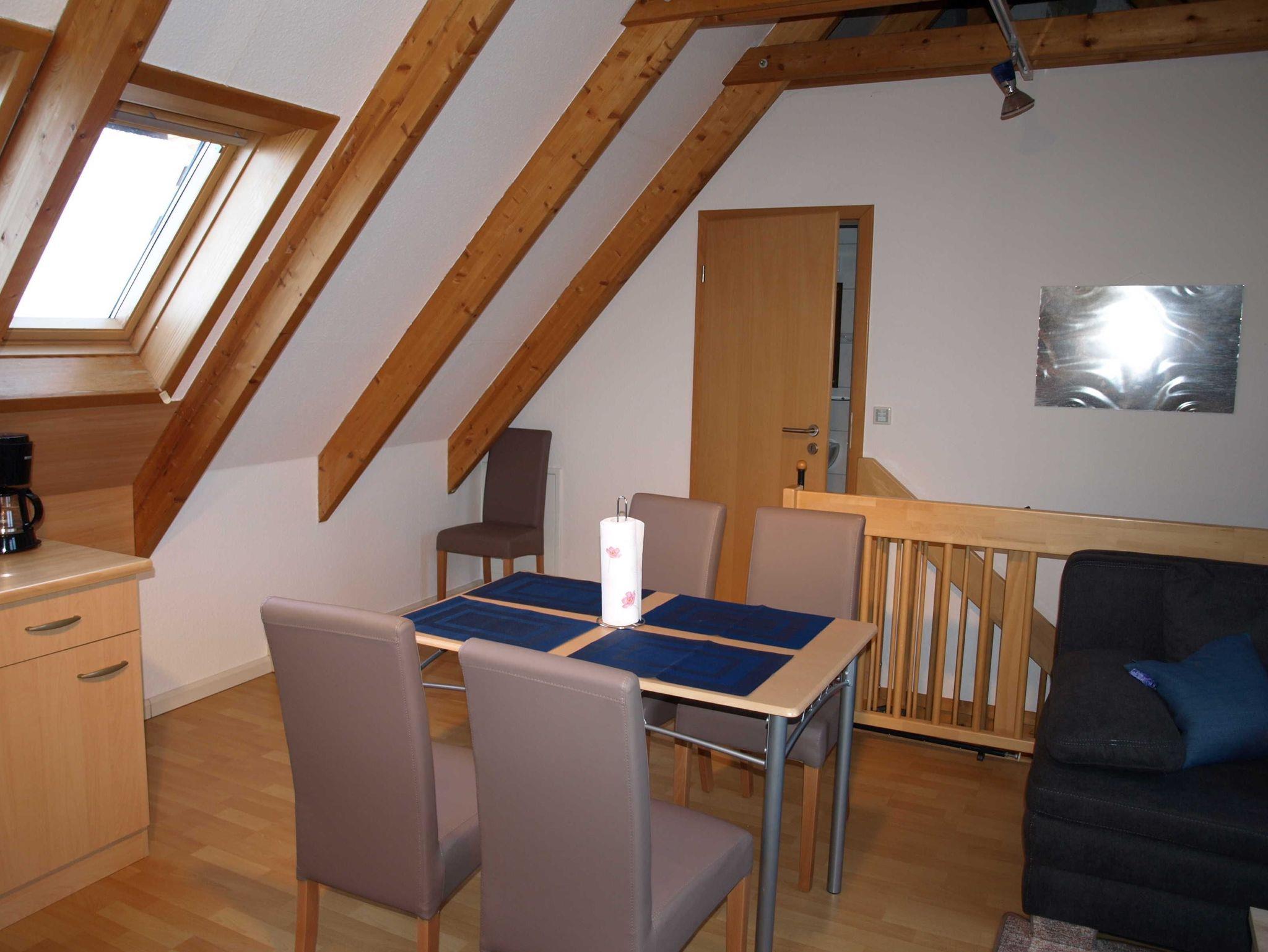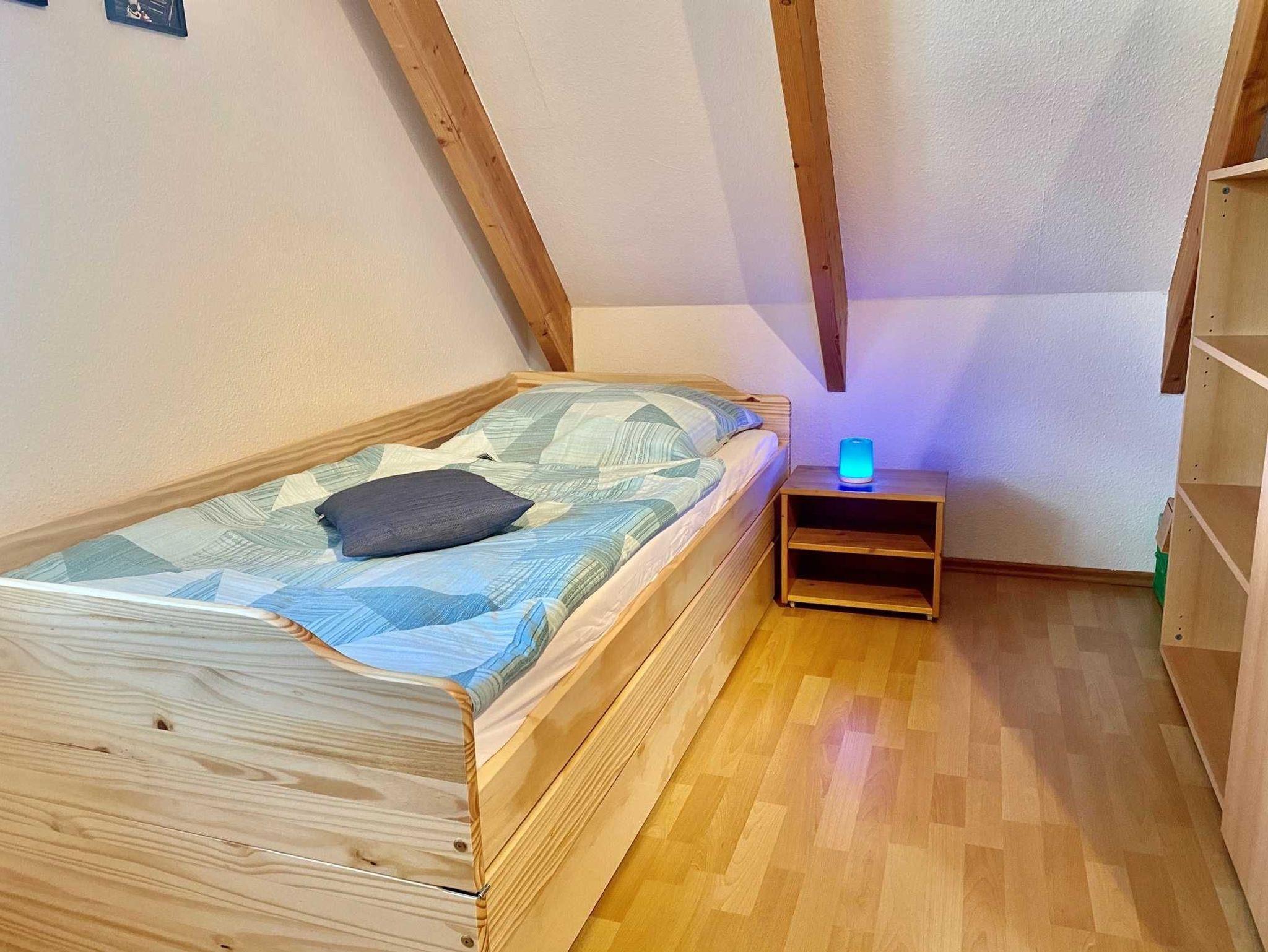 Unsere Ferienwohnung befindet sich direkt im Anbau zu unserem Wohnhaus. (Alle Zimmer haben Dachschrägen) Die Räume sind über eine offene Treppe im unteren Flur zu erreichen. Die Ferienwonung ist ca. 50m² groß, verfügt über ein Schlafzimmer und ein Wohnraum. Beide Räume sind mit elektrischen Außenjalousien zu verdunkeln. Vom Schlafzimmer und Küchenfenster hat man einen schönen Blcik auf die Woblitz. Das Schlafzimmer ist mit einem Doppelbett (2 Liegen je 90x200cm) und einem Einzelbett (90x200), sowie einem Schrank und Regal ausgestattet. Im Wohnraum befindet sich die offene Küchenzeile (Kühlschrank mit Gefrierfach), sowie eine Couch, die zusätzlich als Aufbettung genutz werden kann. Das Bad/WC ist mit einer Badewanne ausgestattet. Außer dem Flur haben alle Räume Fussbodenheizung. Im Wohn und Schlafraum ist Laminat gelegt. Flur und Bad sind gefliest. Alle Steckdosen haben Steckerschutz, die Treppe ein Schutzgitter. Hochstuhl und Babyreisebett sind vorhanden.