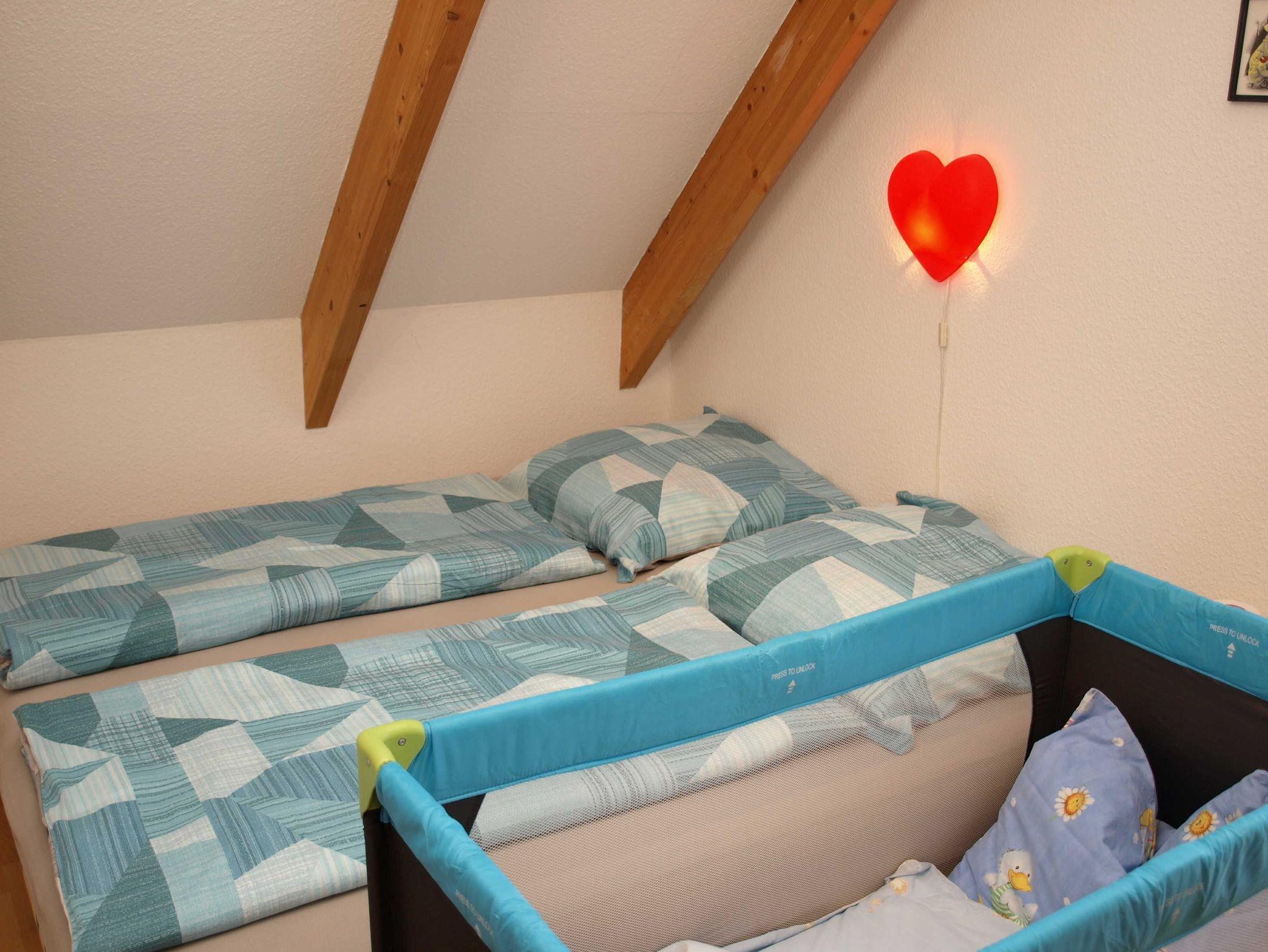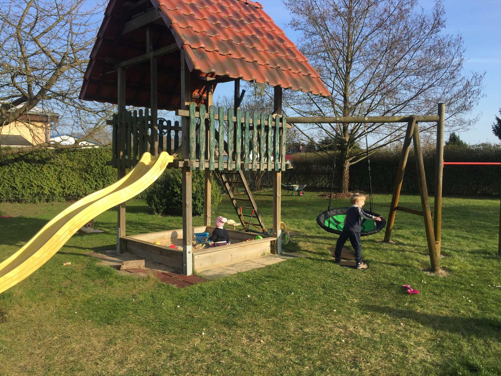 Unsere Ferienwohnung ist baby-und kleinkindgerecht ausgestattet. Überall befindet sich Steckerschutz, ein Treppengitter verhindert das Stürzen. Bei Bedarf kann auch ein Kinderreisebett mit extra Matratze gestellt werden. Ein Hochstuhl, etwas Spielzeug(Spiele für die Großen und Kleinen), Wickelauflage, Toilettensitz, Schemel sind vorhanden. Auf unserem Grundstück gibt es einen kleinen Spielplatz mit Schaukel, Rutsche und Sandkasten. Dieser kann gerne mit genutzt werden.