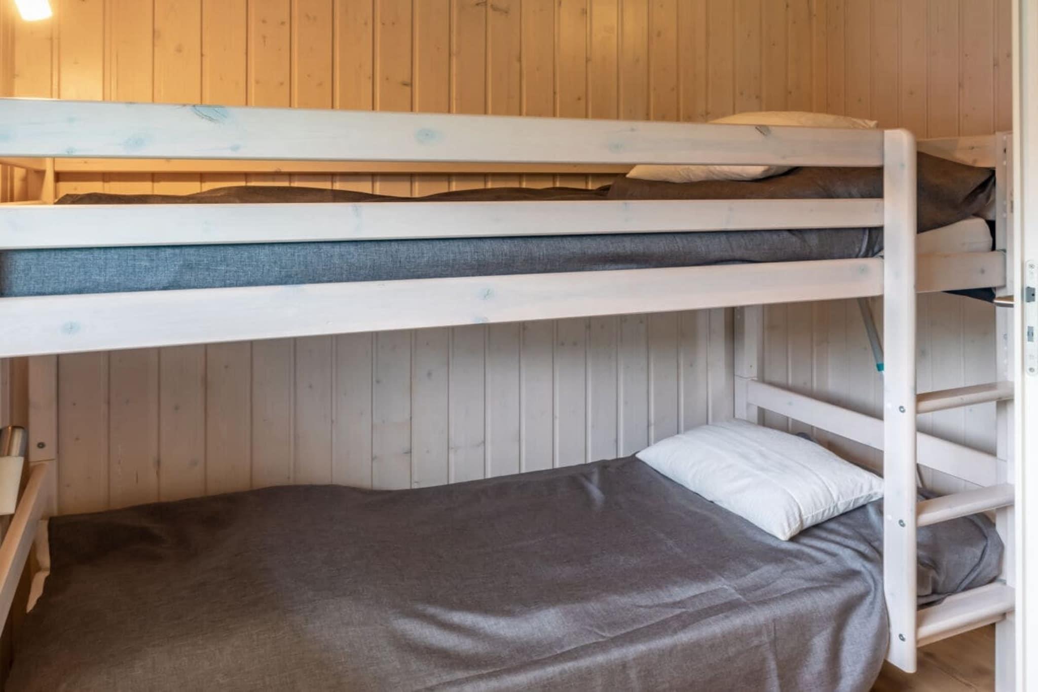 Skandinavisk træhus med sauna og pejs. Stilfuldt indrettet til op til 5 personer. Direkte udsigt over diget, Vesterhavet og den naturlige strand er omkring 200 m væk. Familier med børn eller par, der elsker Nordsøklimaet og leder efter eller ønsker at lære det at kende, er kommet til det rette sted. Sluk blot, lad hverdagens stress ligge, slap af i en strandstol på terrassen med udsigt over diget eller i saunaen. Grill i haven på Weber-grillen eller madlavning i det hyggelige køkken med Thermomix - alt efter vejret kan du nyde det her. I vores hus kan du nyde Vesterhavet fuldt ud - først en afslappet vandretur langs diget, derefter varme dig op i saunaen og slappe af foran pejsen. Den særlige flair inviterer dig til at forlade hverdagens stress og lade dig rive med af roen og hyggen. Huset er fordelt på cirka 68 kvadratmeter. Fra stuen er der adgang til den lille alkove, hvor der er en madras på gulvet, hvor en femte person kan sove. Fra stuen kommer man ind i soveværelset med dobbeltseng og udgang til sydterrasse. Badeværelset med sauna fører også ud til stuen. Gennem hoveddøren kommer man direkte ind i køkkenet, hvorfra værelset med de to køjesenge leder ud. Badeværelset og køkkenet er flisebelagt med elegante mørke klinker, mens stue og soveværelser har laminat i trælook. Det store spisebord med op til 6 siddepladser er også placeret i stuen. TV og musikanlæg er der også.