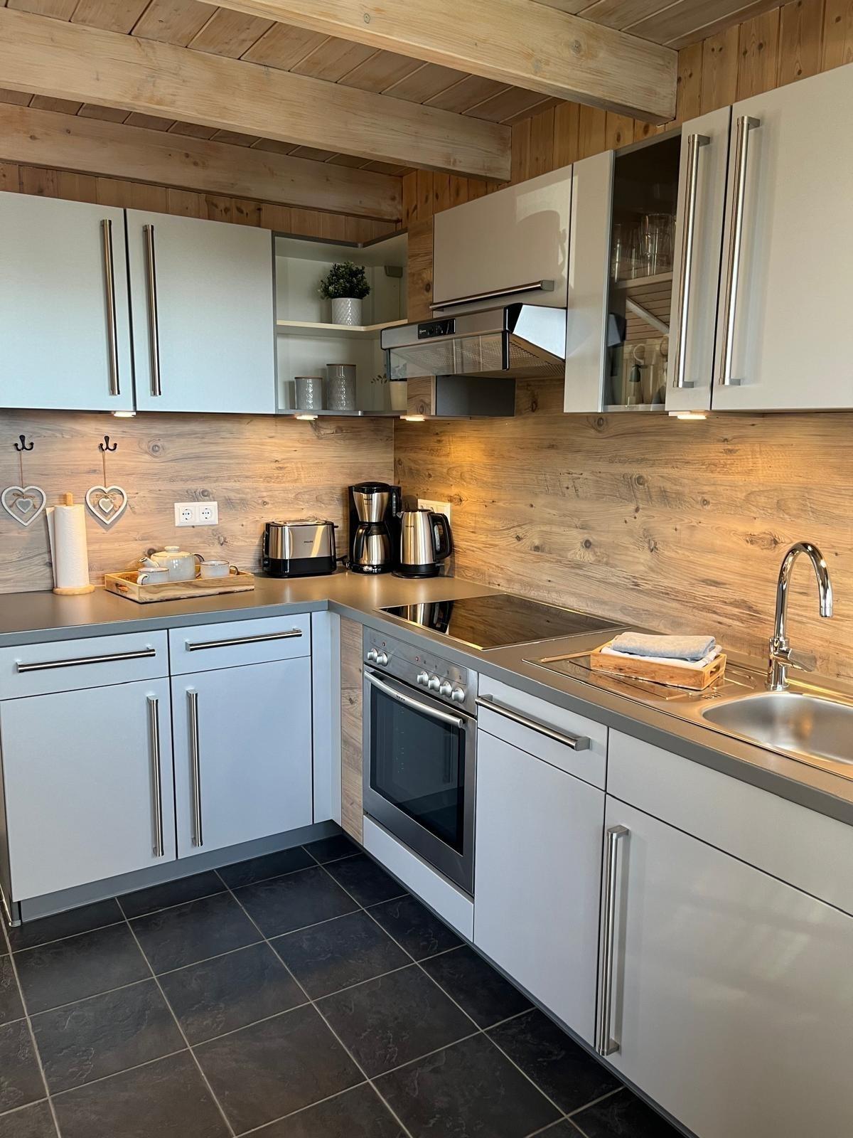 Das moderne Ferienhaus Deichglück verfügt über einen offenen Wohn-/ Essbereich mit angrenzender, überdachter Terrasse. Die moderne Küche ist ausgestattet mit einem Kühlschrank, Backofen, Cerankochfeld, Spülmaschine und sämtlichen Küchenkleingeräten. Die direkt an den Wohnraum angrenzende Terrasse ist überdacht und mit einem Windschutz aus Glas umrandet. Im modern gestalteten Wohnbereich bereitet Ihnen ein integrierter Kamin auch bei schlechten Wetterverhältnissen einen gemütlichen Nordseeaufenthalt.