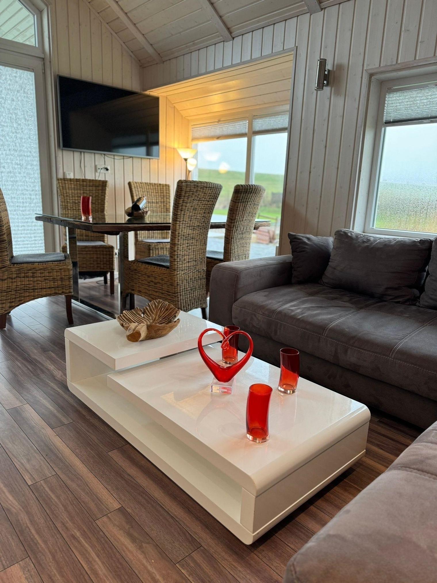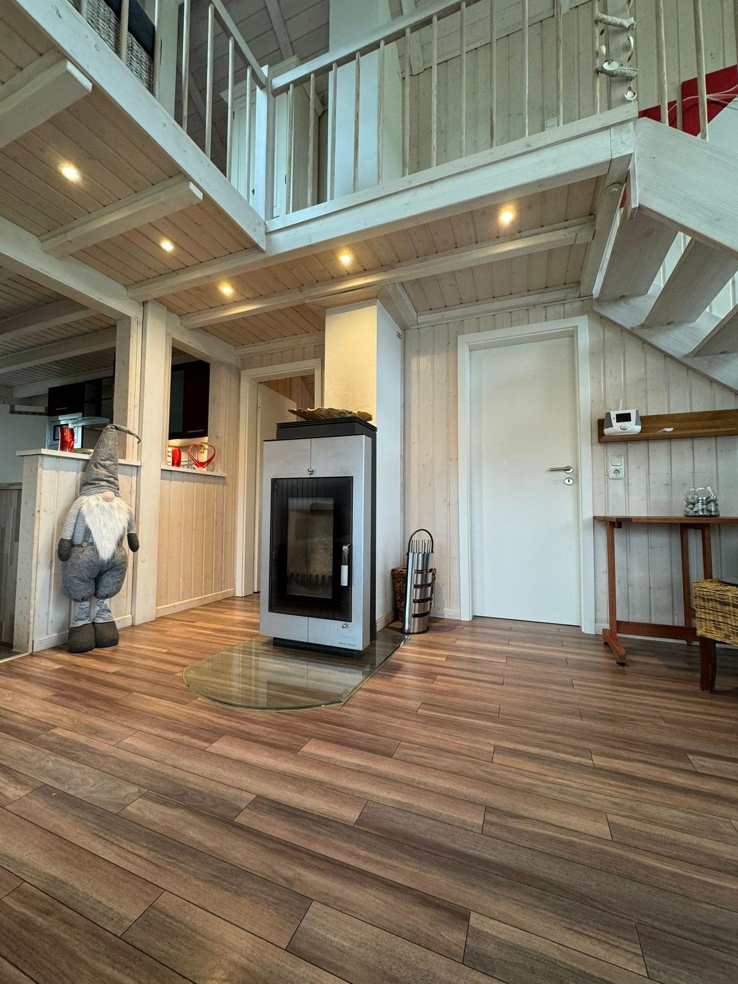 Die Panoramaverglasung bietet einen herrlichen Blick aus dem Wohnzimmer und Schlafzimmer in den 1.500 m² großen, schönen Garten, auf den hauseigenen Teich und den Nordseedeich. Eine Ruheoase pur. Zwei überdachte Terrassen nach Süden und Osten und 2 PKW-Stellplätze stehen zur Verfügung. Wohnzimmer und 3 Schlafzimmer sind mit LED-Flachbildschirmen ausgestattet. Der Wohnraum bietet mit schönem Kaminofen Raum zum Wohlfühlen und entspannen an kalten Tagen. Mit Ausnahme der Galerie sind alle Räume ebenerdig barrierefrei. Wlan, Hifi-Anlage, gemütliche Couchgarnitur und hochwertiger Esstisch für bis zu 6 Personen lassen keine Wünsche offen. Die moderne Einbauküche ist voll eingerichtet mit Geschirrspüler, Mikrowelle sowie Kühl- u. Gefrierschrank und Spülmaschine. Die Heizung erfolgt über Heizkörper aber auch alternativ über Fußbodenheizung. Genießen Sie das Wellnessbad mit hohen Decken, Whirlpool-Wanne, großer Dusche und Sauna.