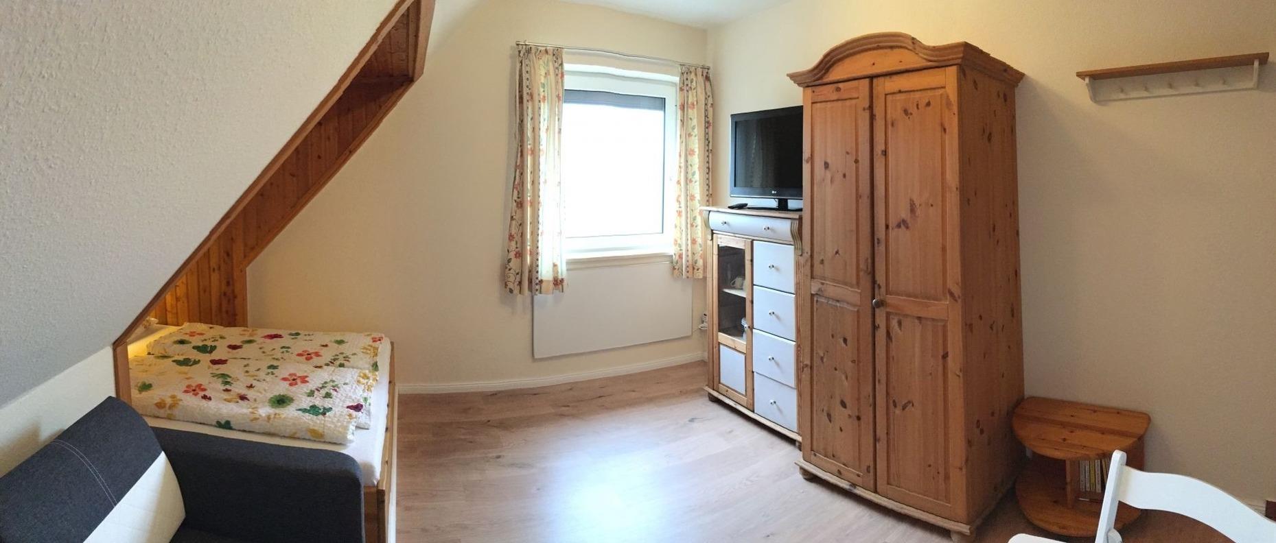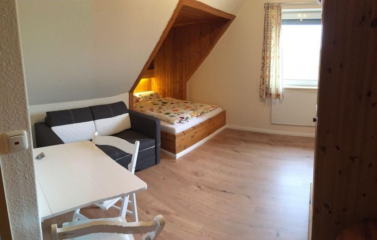Die Wohnung verfügt über ein Doppelbett (1,40 × 2,00 m), das in eine Dachnische eingelassen ist und dadurch eine besonders gemütliche, kuschelige Atmosphäre schafft – fast wie ein kleiner Alkoven. Ergänzt wird die Wohnung durch einen kleinen Essbereich, ein Sofa, eine praktische Pantry-Küche sowie ein Duschbad. Bettwäsche und Handtücher stellen wir selbstverständlich zur Verfügung, sodass Sie unbeschwert anreisen können. Die Einrichtung ist funktional und wohnlich gehalten und bietet einen angenehmen Rückzugsort für erholsame Tage.