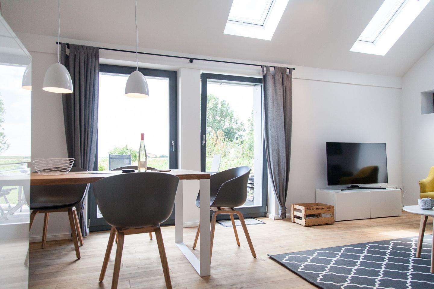 Der offene Wohnbereich verbindet modernes Design mit einem gemütlichen Ambiente und erwartet Sie mit einem einladenden Essbereich, einer bequemen Sofaecke sowie einem unterhaltsamen Kicker und einer Tischtennisplatte für gesellige Runden. Auf der Terrasse können Sie den Blick auf die schöne Landschaft genießen, während die Kinder im sicheren Gartenbereich spielen. Auch das historische Flair des Gulfhofs, der im Jahr 1805 erbaut wurde, verleiht Ihrem Aufenthalt eine besondere Note.