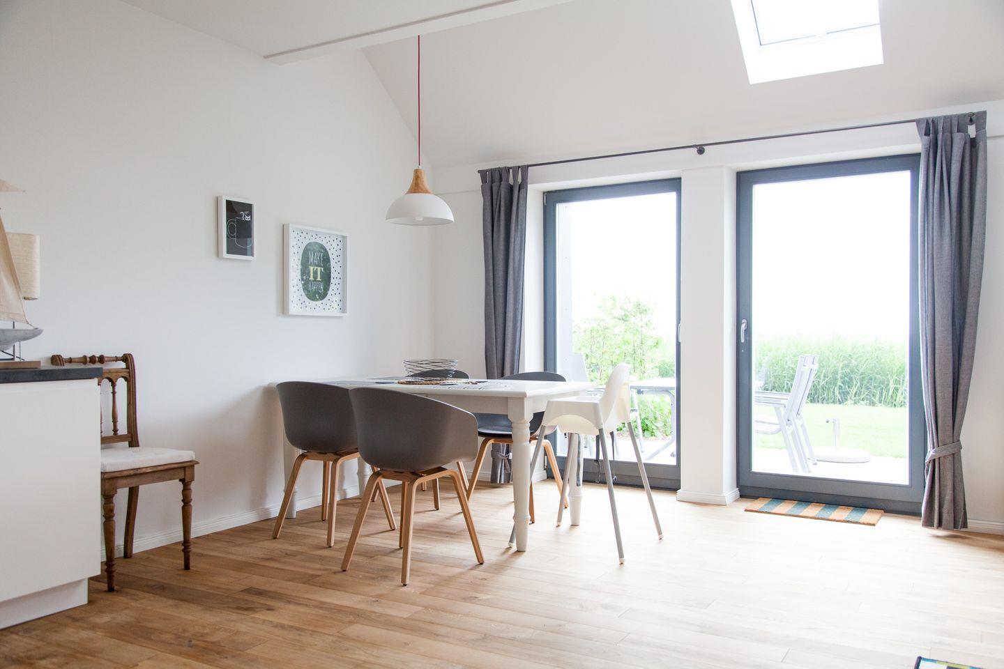 Die Wohnung erstreckt sich über zwei gemütliche Schlafzimmer, die mit Parkett ausgelegt sind und eine ruhige Atmosphäre bieten. Ein komfortables Wohnzimmer mit einer Sofaecke und einem Esstisch lädt zum Verweilen und gemeinsamen Abendessen ein. Der offene Küchenbereich ist vollständig ausgestattet und lässt keine Wünsche offen. Hier bereiten Sie leckere Gerichte, die Sie auf der großzügigen Terrasse bei frischer Luft und Blick in den Garten genießen können. Für ein besonderes Genuss Erlebnis steht Ihnen eine Nespresso-Maschine zur Verfügung, perfekt für eine Tasse Kaffee zu jeder Tageszeit am Deich.