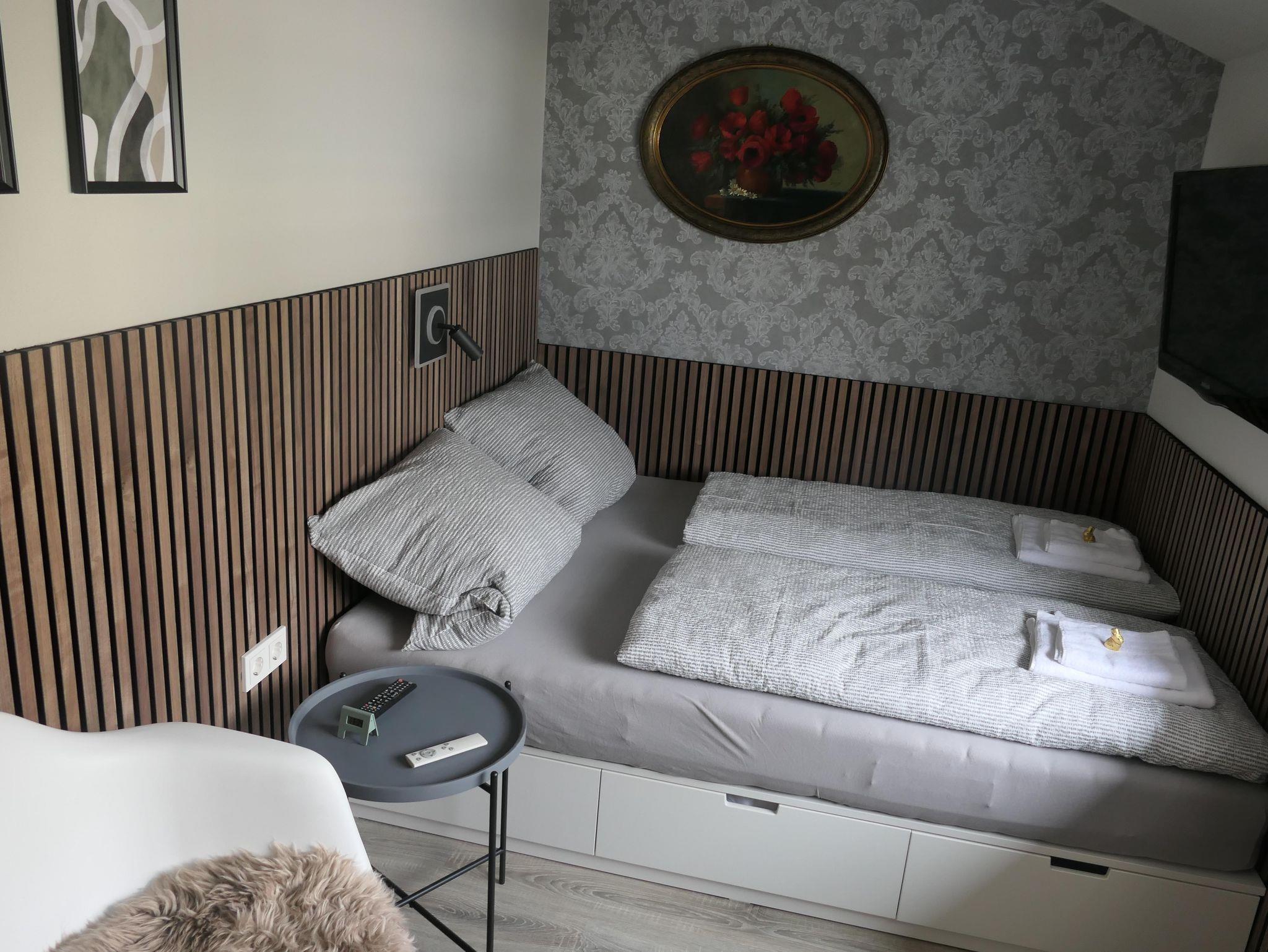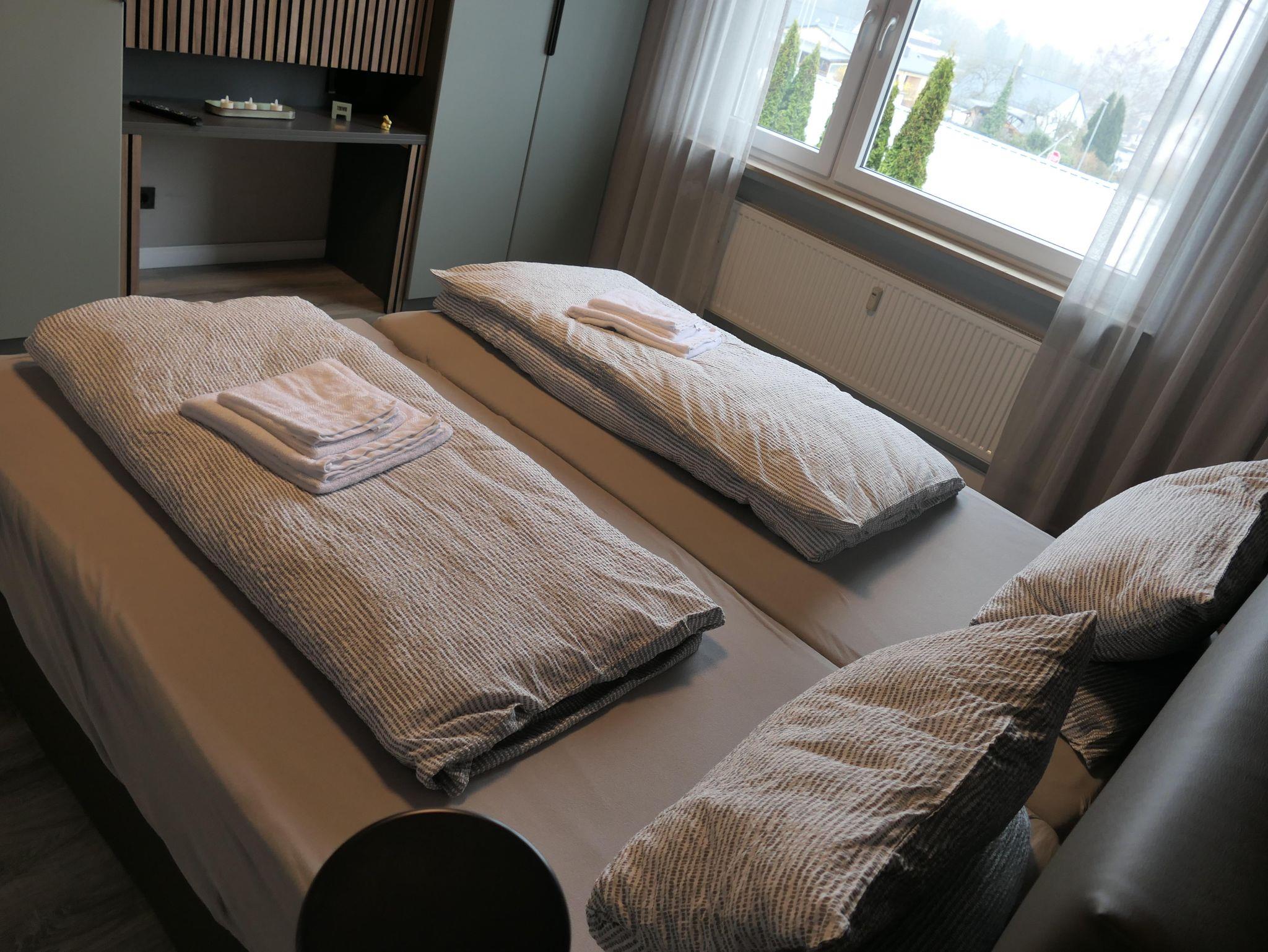 • Zwei Boxspring Einzelbetten (100x200 cm) mit hochwertigen Matratzen und Bettwäsche