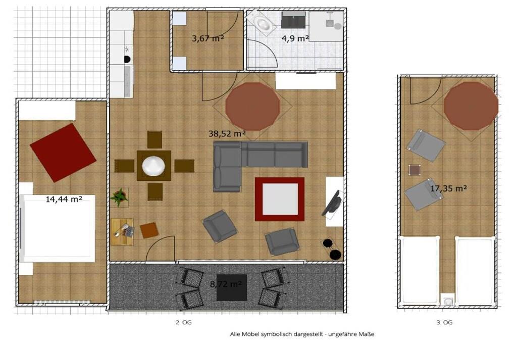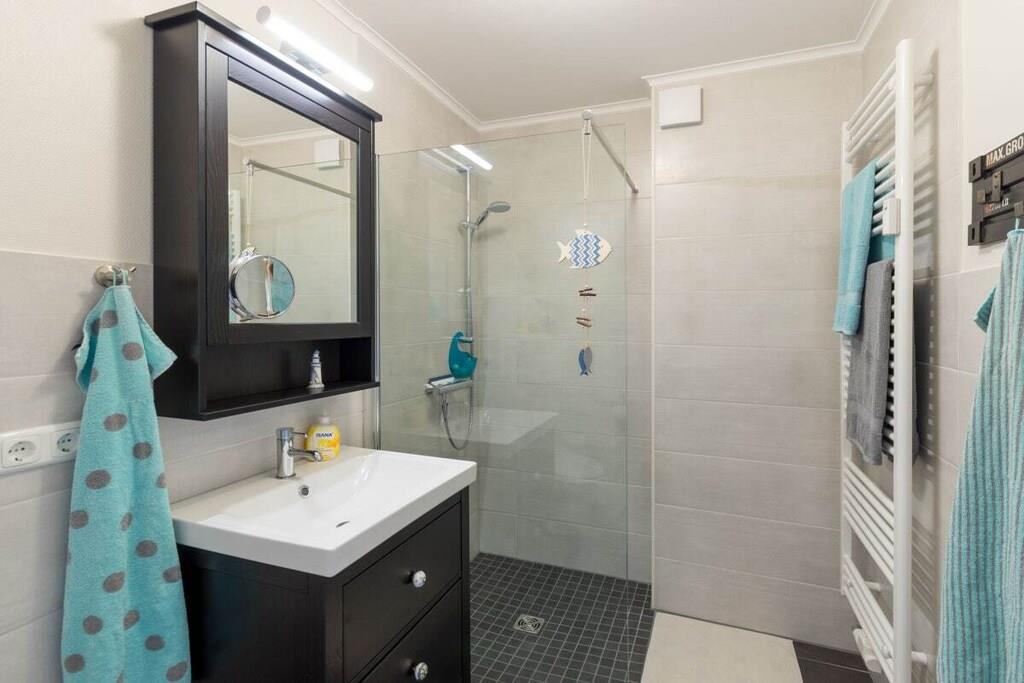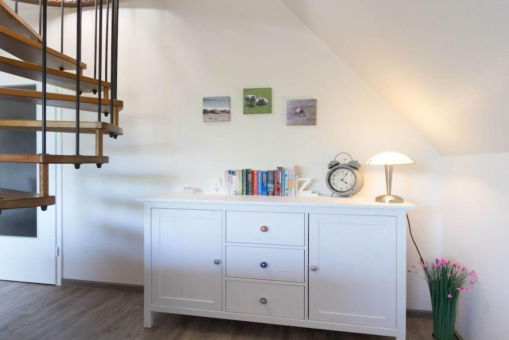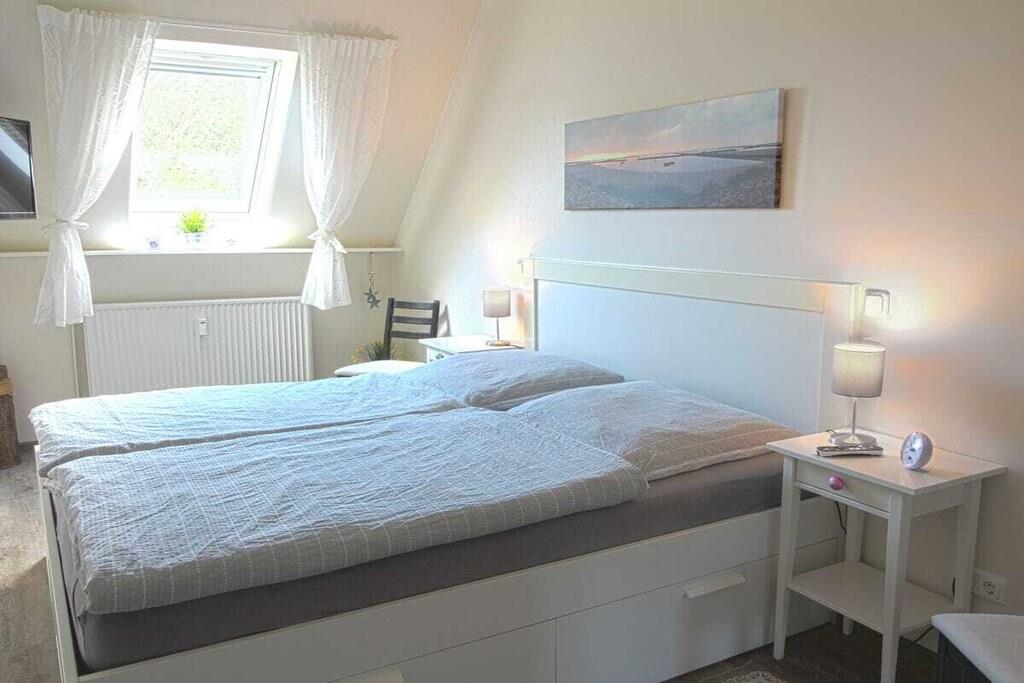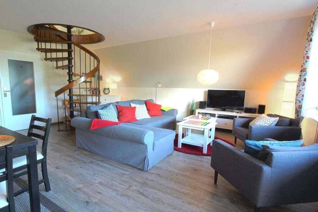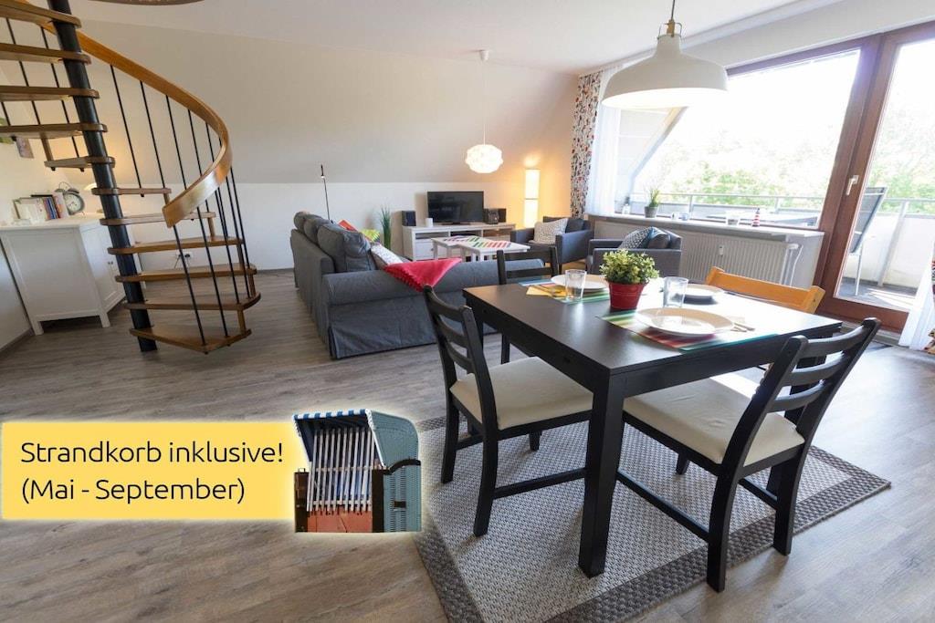 Din ferielejlighed er cirka 70m² stor, byder på optimal komfort til 4 personer og er blandt andet udstyret med altan. Vi totalrenoverede og istandsatte din ferielejlighed i foråret 2017. Det byder på rummelig stue-spisestue med stor altan og fuldt udstyret åbent køkken, separat soveværelse og hems, som du kan nå via den charmerende vindeltrappe direkte fra stuen, samt brusebadeværelse og entre med garderobe. Her er god plads til fire personer. Vi tilbyder en gratis internetforbindelse (WLAN) og en telefon med fast takst til det tyske fastnet. I månederne maj - september er en strandstol ved Stinteck-badepladsen inkluderet! Der er vaskemaskine med tørretumbler i lejligheden.