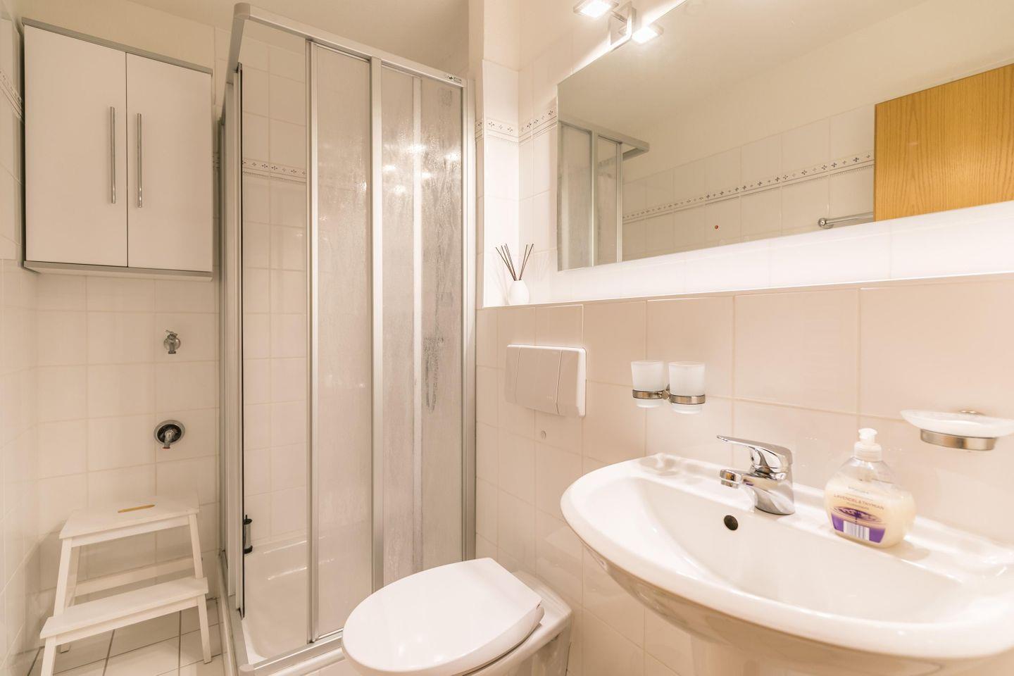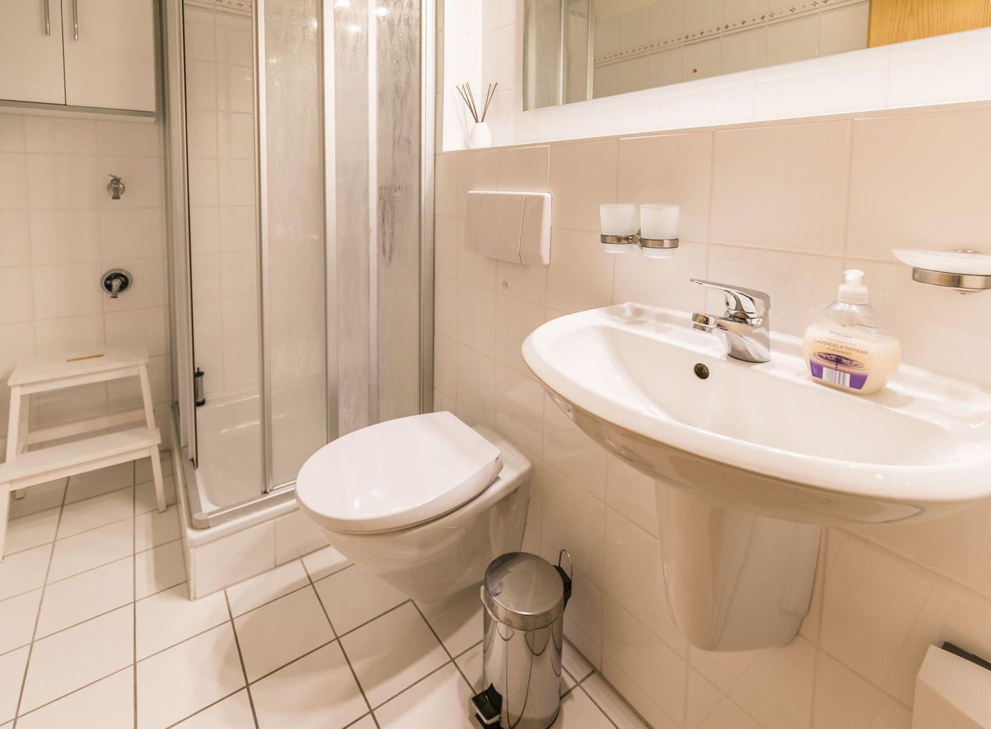Dusche, WC, Spiegel, Waschbecken, Haartrockner, Abluft, Handtuchtrockner