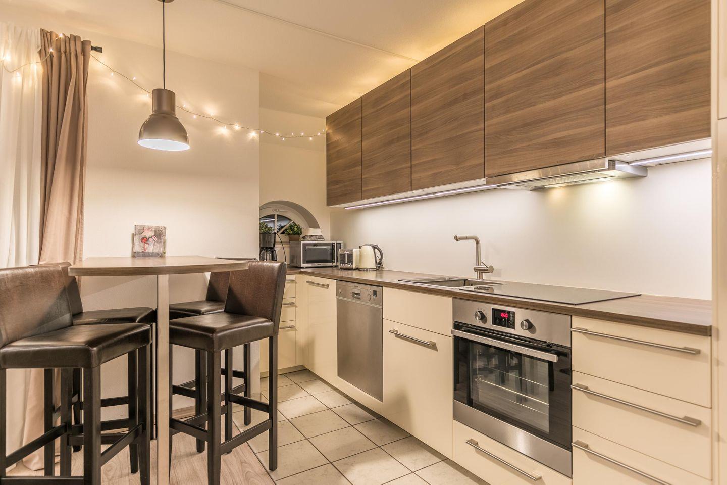Kühlschrank m. Gefrierfach, Ceranfeld, Backofen, Geschirrspüler, Wasserkocher, Toaster, Kaffeemaschine, Eierkocher, Mikrowelle