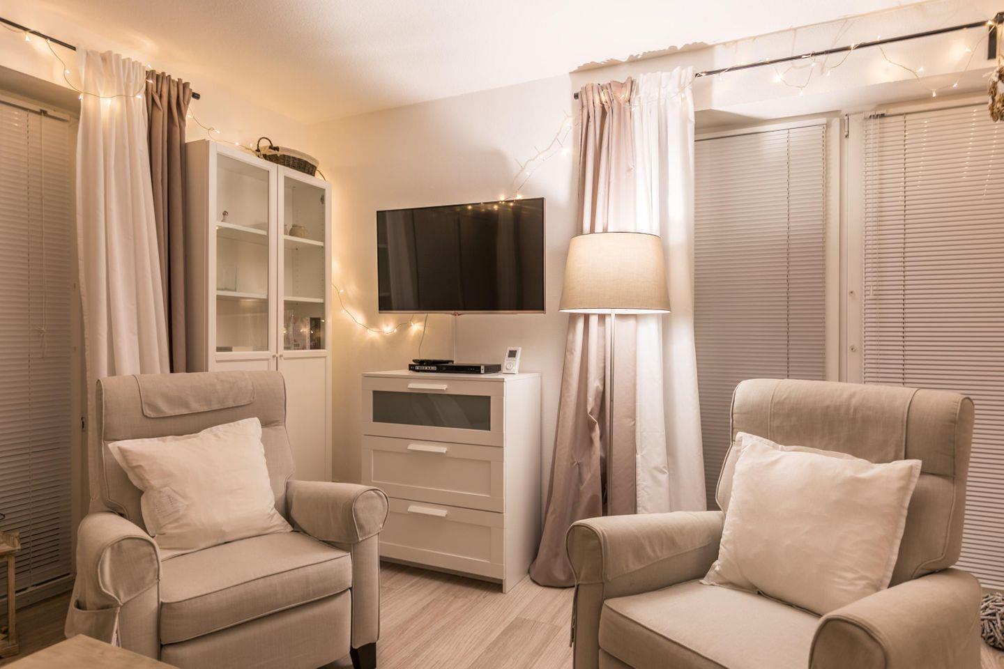 Couch, 2 Sessel, Flachbild-TV, Blu-Ray-Player, Kommode, Schrank, Leselampe, Zugang zur West-Terrasse, Tisch und Bar-Stühle, Vorhang, Fliegengittertür