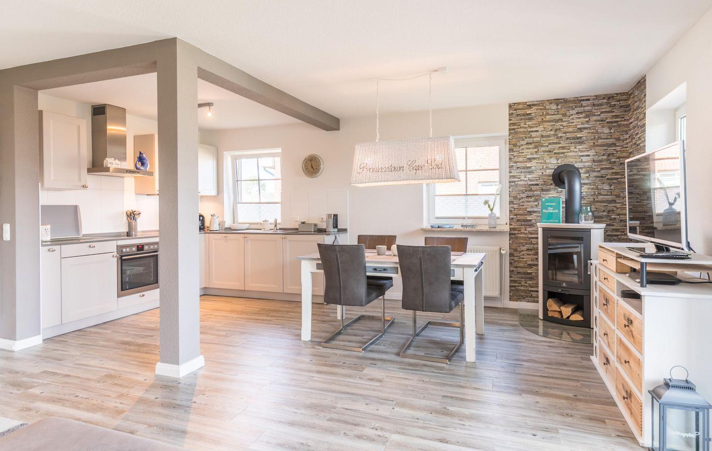 In der Unterkunft selbst, ist der moderne Wohnraum offen zur voll ausgestatteten Küche gehalten. Der Kaminofen trägt nach langen Spaziergängen zur Gemütlichkeit bei.