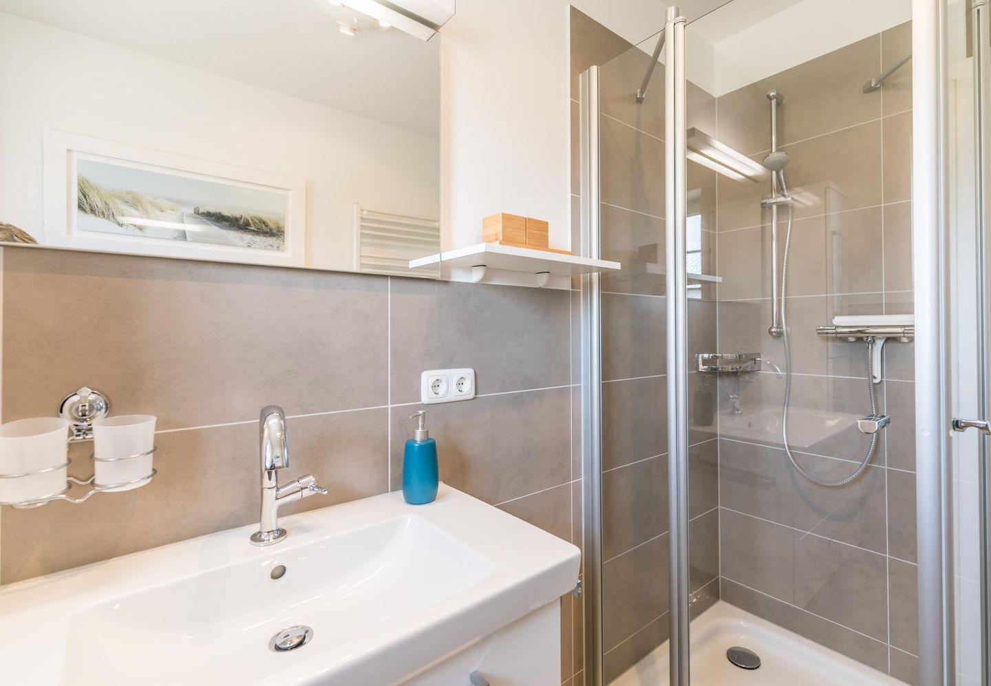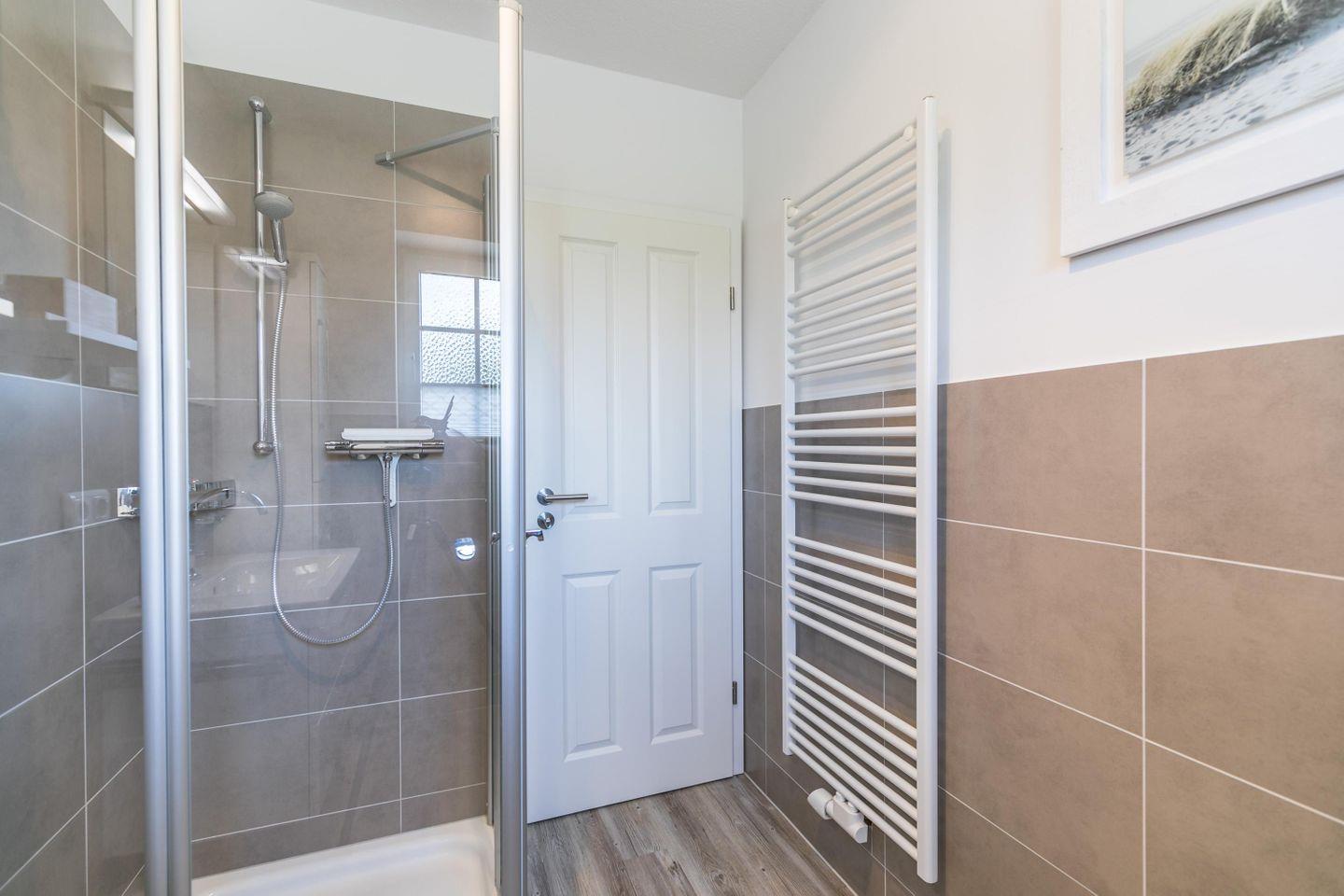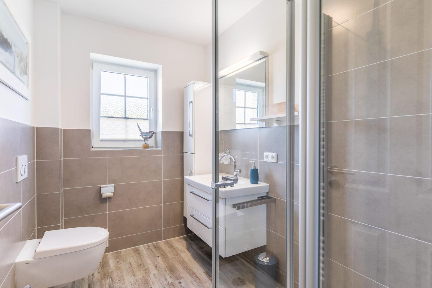 Dusche, WC, Waschtisch mit beleuchtetem Spiegelschrank, Fenster, Fußbodenheizung, Handtuchtrockner