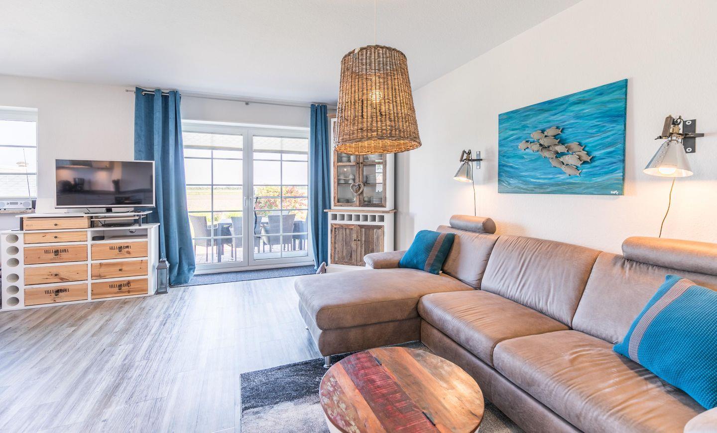 Die Einrichtung, im maritimen Flair gehalten und der wunderschöne Weitblick über die Felder, Richtung Büsum machen diese Wohnung so besonders.