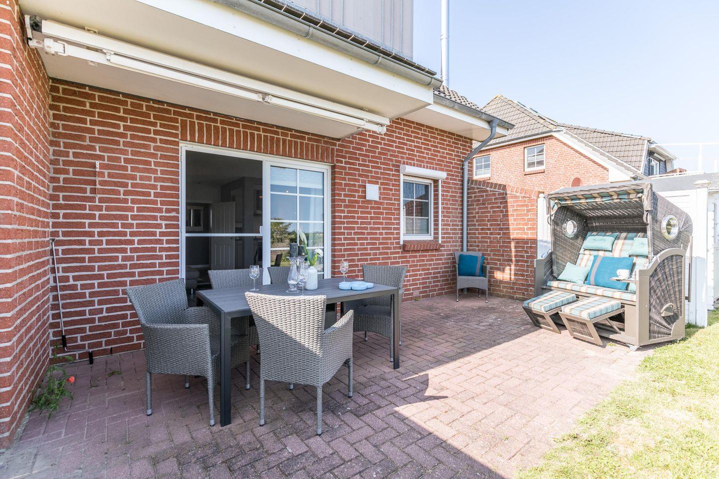 Die Terrasse mit einem großen Strandkorb lädt zum sonnenbaden ein.